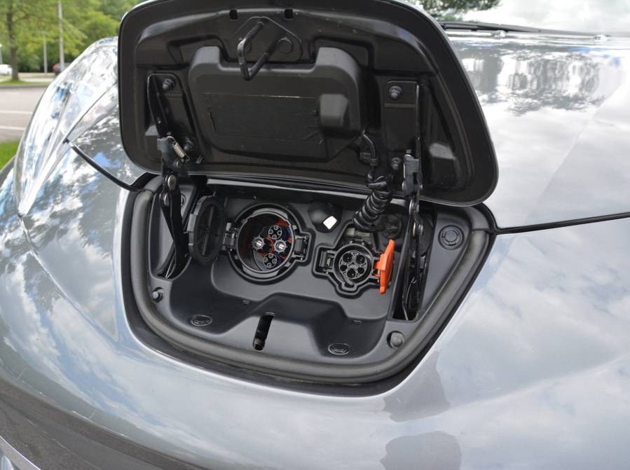 Un petit capot à l’avant de l’auto abrite les prises pour la recharge.
