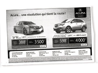 - L’Acura TL illustrée ne correspond pas au modèle annoncé. La voiture montrée est équipée de jantes en alliage d’une valeur de 2 485 $ qui ne sont pas comprises dans le modèle annoncé. Ce n’est qu’en lisant les petits caractères qu’on apprend que la photo est «à titre indicatif seulement». Dans le cas des autos d’occasion, les commerçants se sont engagés à publier une photo fidèle au modèle offert en vente, ce qui évite cette forme de représentation erronée.