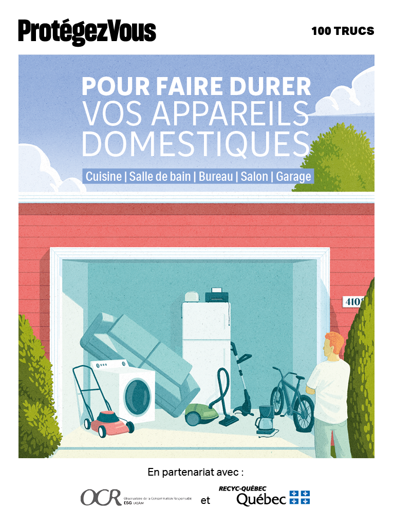 Fatigué de remplacer votre aspirateur tous les trois ans parce qu’il n’aspire plus? Savez-vous comment protéger la pile de votre cellulaire afin qu’il conserve sa pleine capacité ? Quels sont les gestes simples à adopter au quotidien afin d’augmenter la durée de vie de nos appareils domestiques et d’ainsi réduire le gaspillage ? Le Guide 100 trucs pour faire durer vos appareils domestiques présente des fiches pratiques afin de vous aider à entretenir vos appareils afin de les conserver longtemps. Réalisé en partenariat avec RECYC-QUÉBEC et l'expertise de l’Observatoire de la consommation responsable de l’École des sciences de la gestion de l’UQAM.