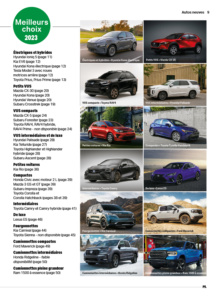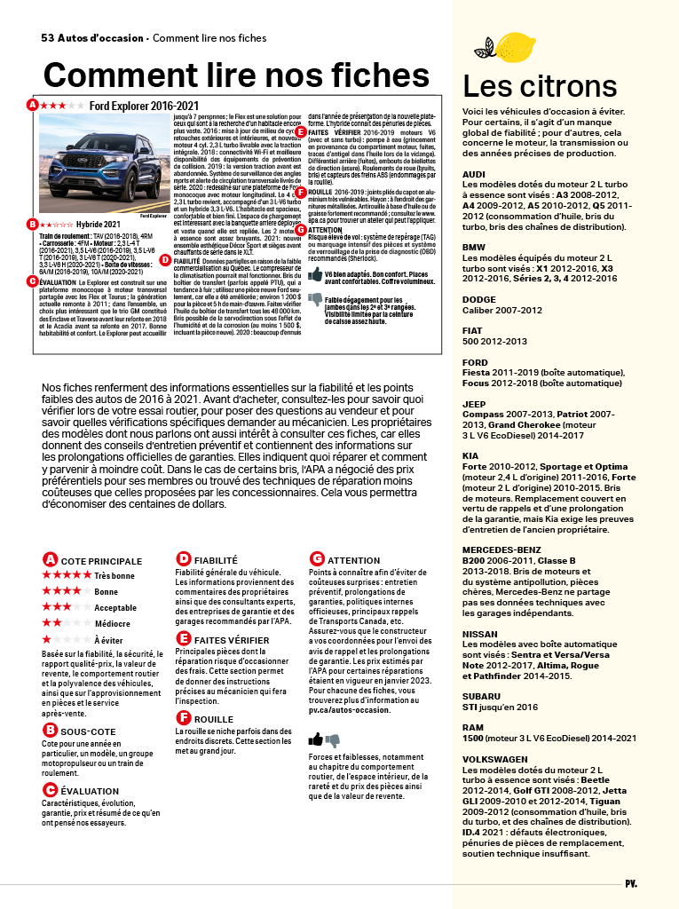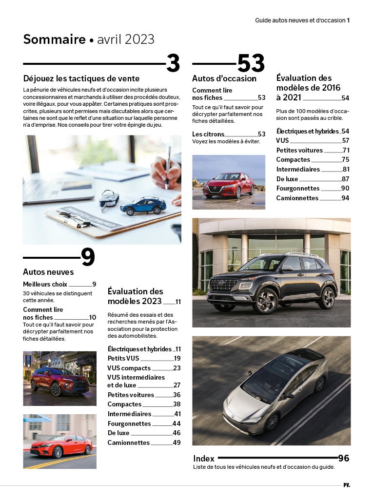 Ce guide unique, réalisé en collaboration avec l’Association pour la protection des automobilistes (APA), comprend près de 300 évaluations détaillées, dont 200 véhicules neufs, des compactes aux VUS en passant par les véhicules verts ; et près de 100 modèles d’occasion, de 2016 à 2021.