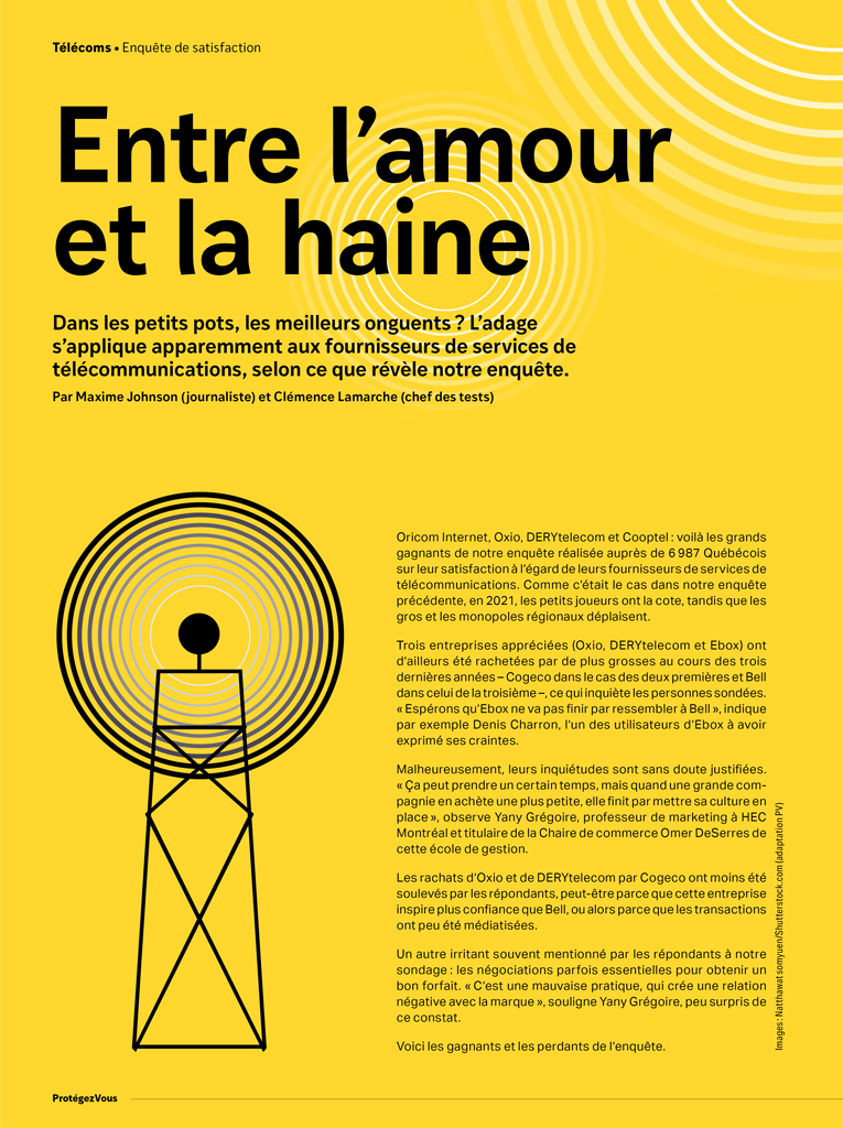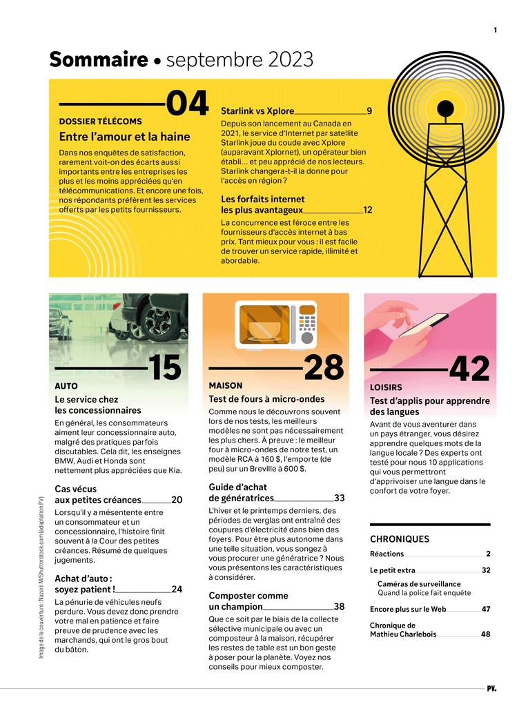 Plus de 6 987 personnes se sont prononcées sur leur appréciation à l’égard des fournisseurs de services de télécommunications. Un constat : dans les petits pots, les meilleurs onguents! Aussi dans ce numéro, les forfaits internet les plus avantageux, et ce qu’il faut savoir sur Starlink et Xplore.