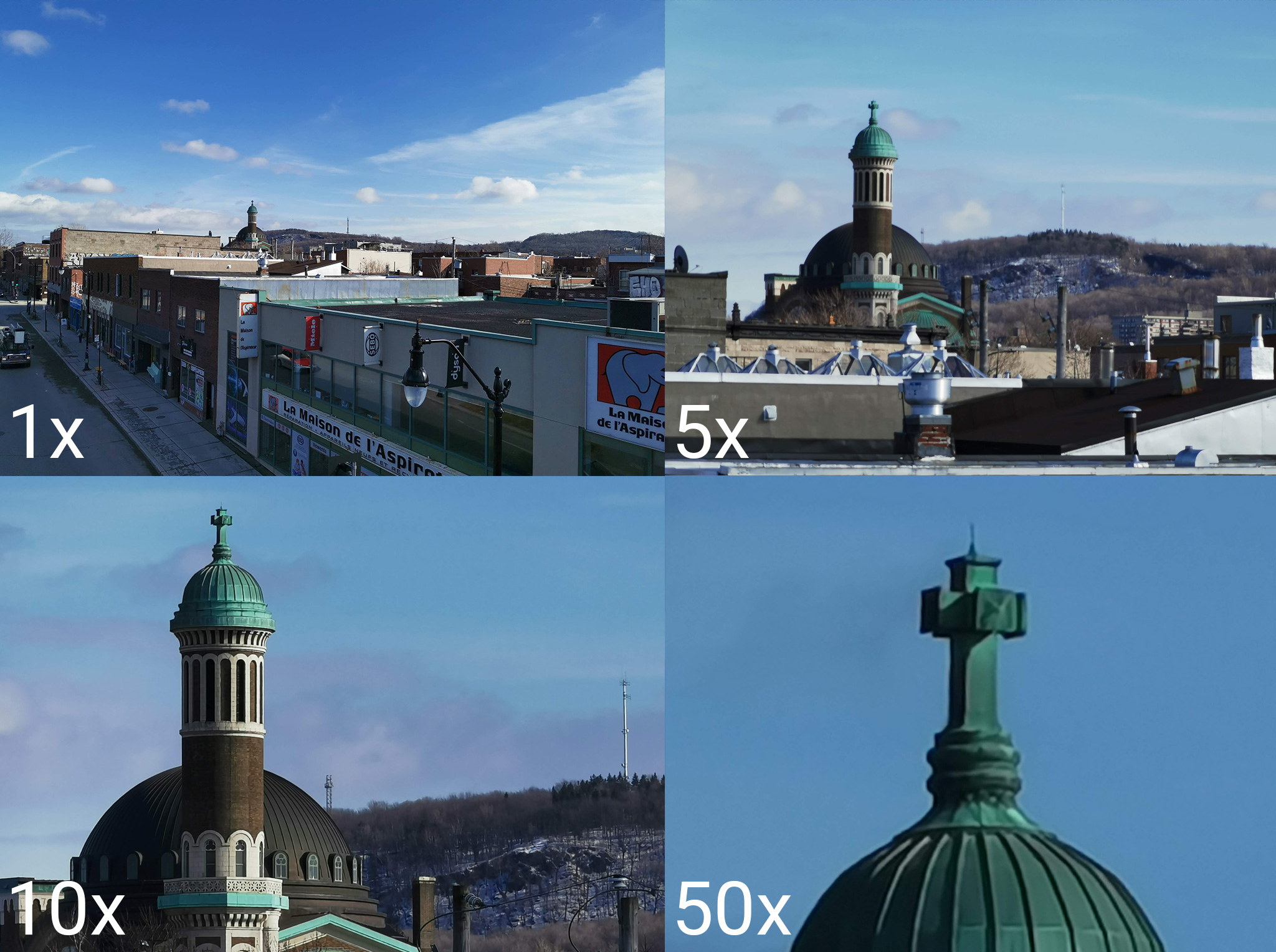 Le téléobjectif est l’un des composants les plus impressionnants du P30 Pro. Le zoom optique va jusqu’à 5x sans créer de saillie à l’extérieur de l’appareil, fonctionnant plutôt comme un périscope caché à l’intérieur du téléphone. Jusqu’à 10x, un «zoom hybride» combine le zoom optique et l’intelligence artificielle, donnant ainsi de très bons résultats. En zoom numérique, le P30 Pro peut aller jusqu’à 50x, mais les clichés sont alors flous et peu détaillés.