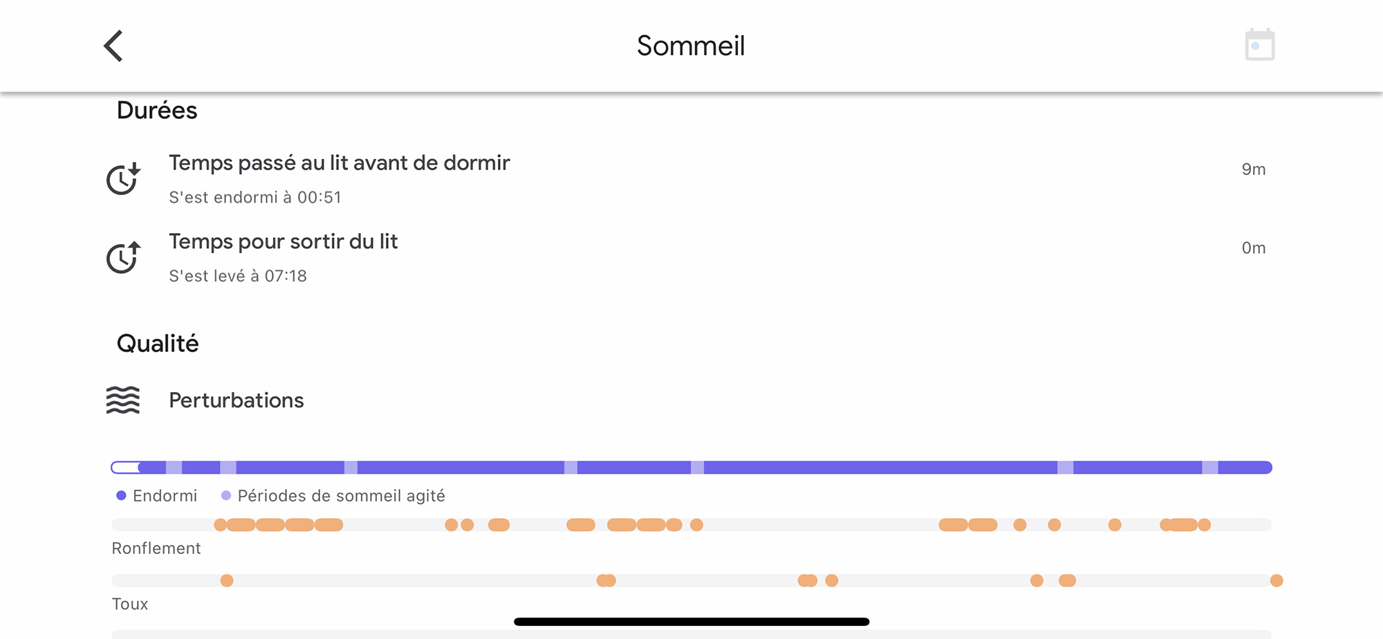On peut notamment voir quand on est allé au lit et quand on s’est levé, mais aussi quand on s’est endormi. L’application indique notre efficacité au lit (il faudrait passer de 85 % à 95 % du temps endormi, selon Google), si on a respecté notre horaire, les moments où on s’est réveillé, nos périodes de ronflement et de toux, ainsi que les changements de luminosité. L’application indique finalement notre rythme de respiration tout au long de la nuit.