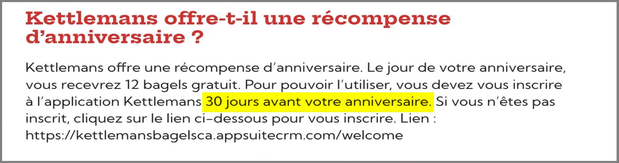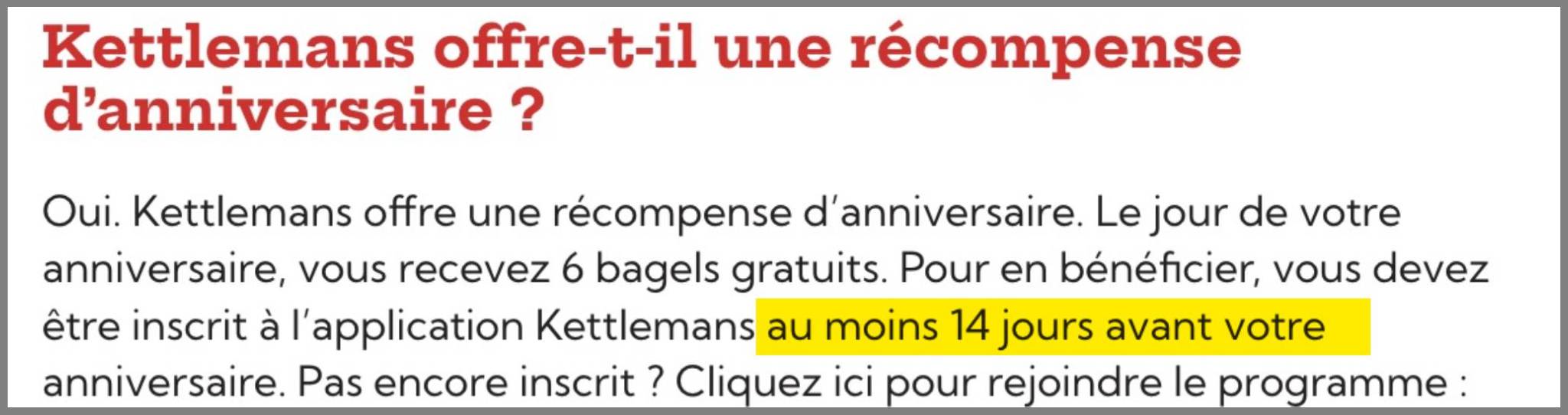 - Promo ci-dessus : parfois, l'inscription à un programme de fidélité doit être faite plusieurs jours avant que la gratuité d'anniversaire ne soit demandée.