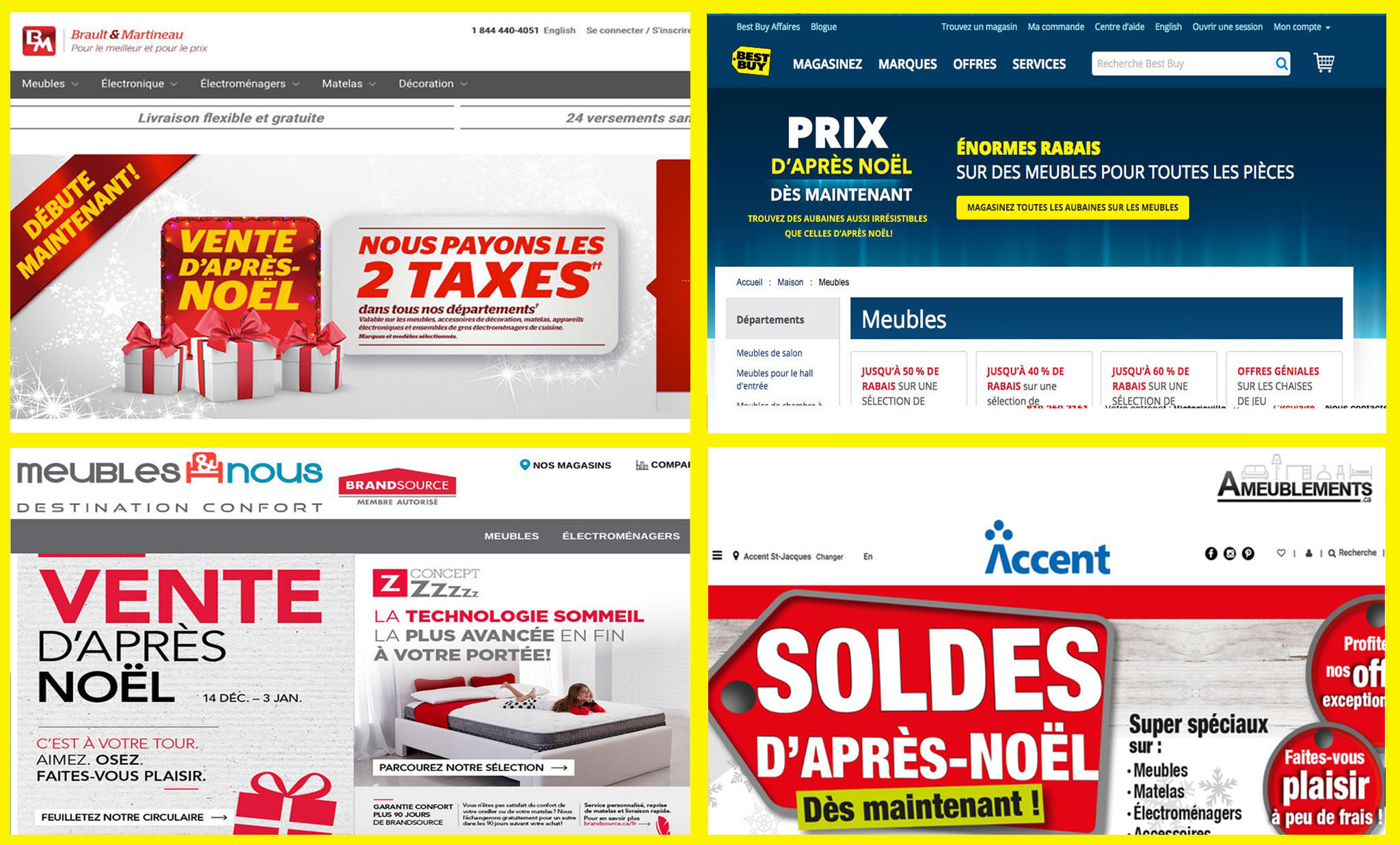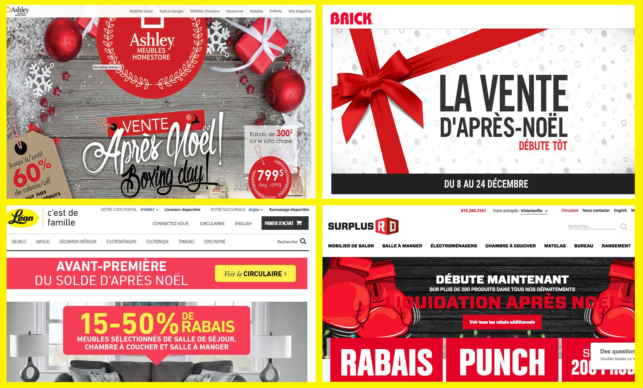 Sachant cela, comment renverser la vapeur et inciter les clients à venir en magasin? En offrant des soldes d’Après-Noël avant tout le monde! Le hic, c'est que tout le monde offre des économies d’Après-Noël avant Noël. Voyez par vous-même: