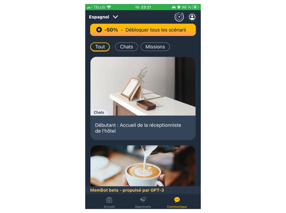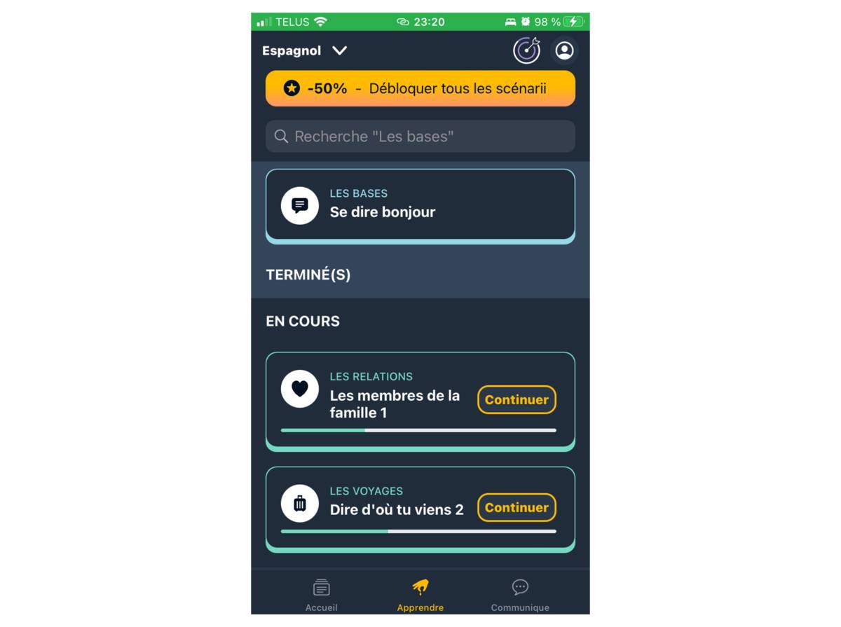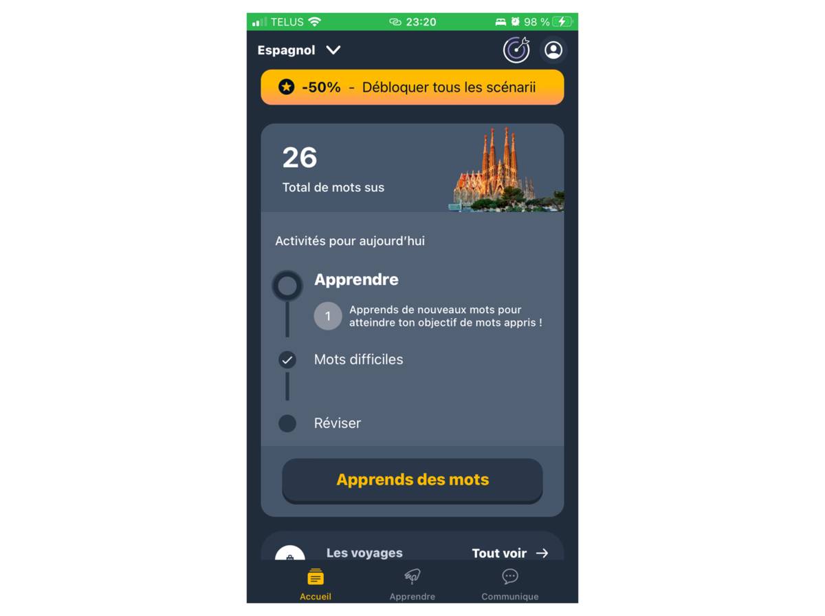 - Abonnement Pro – accès complet à toutes les langues, tous les cours débloqués, 30 000 clips vidéo de locuteurs natifs, sans publicité