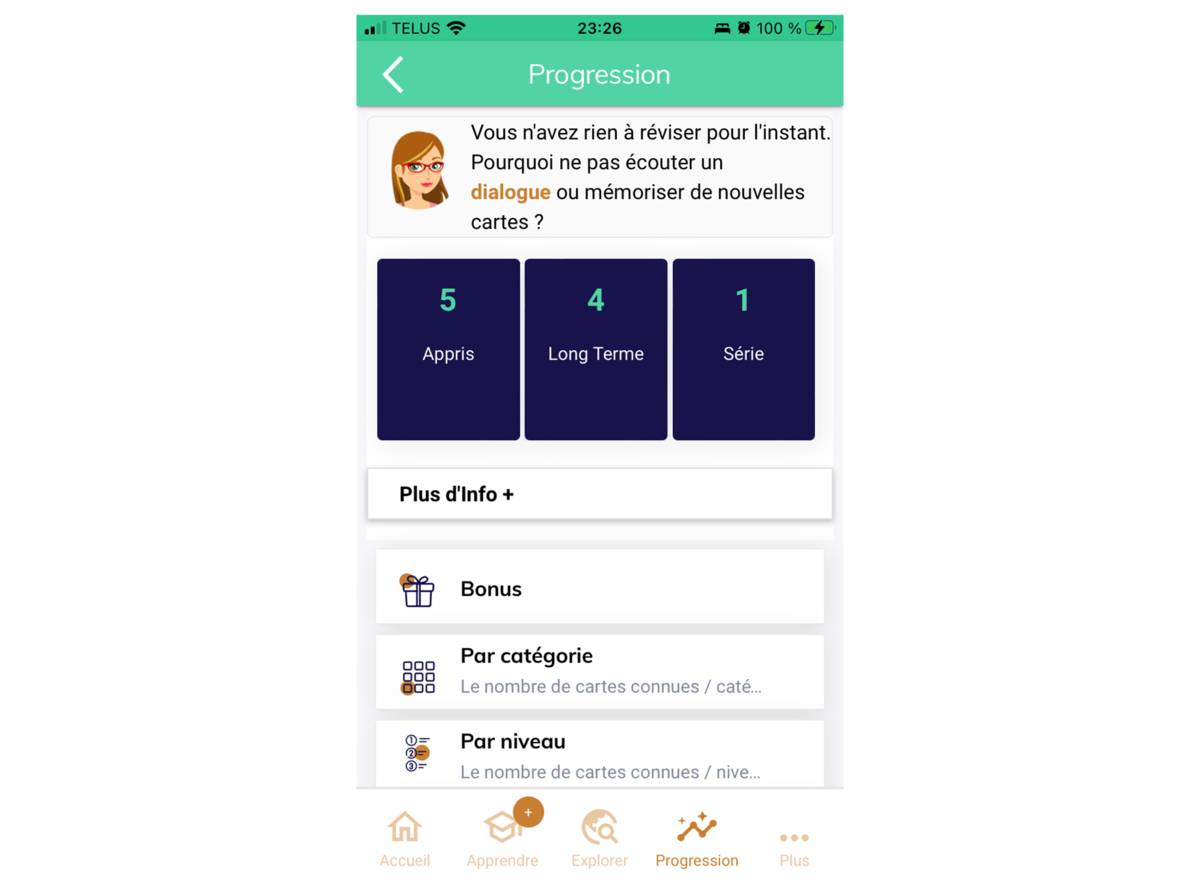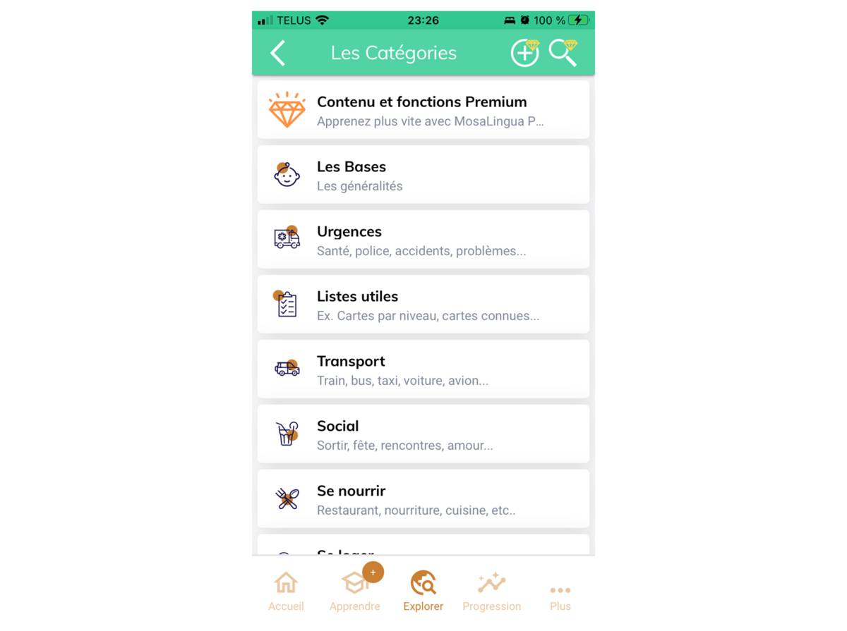 - MosaLingua Premium – accès à l'apprentissage illimité, révisions quotidiennes, accès à tous les dialogues, astuces de grammaire, cartes-éclair personnalisées