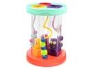 Jouet en plastique de 20 cm muni de 3 tiges sur lesquelles on fait glisser des perles. Comprend 3 formes géométriques qui émettent un son lorsqu’on les insère dans les tubes. L’ensemble peut servir de rouleau, une fois à l’horizontale.