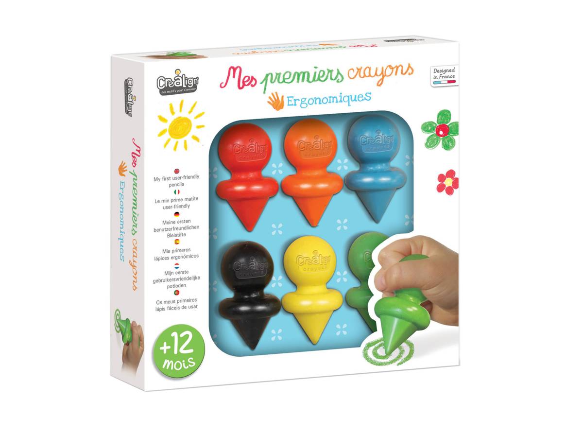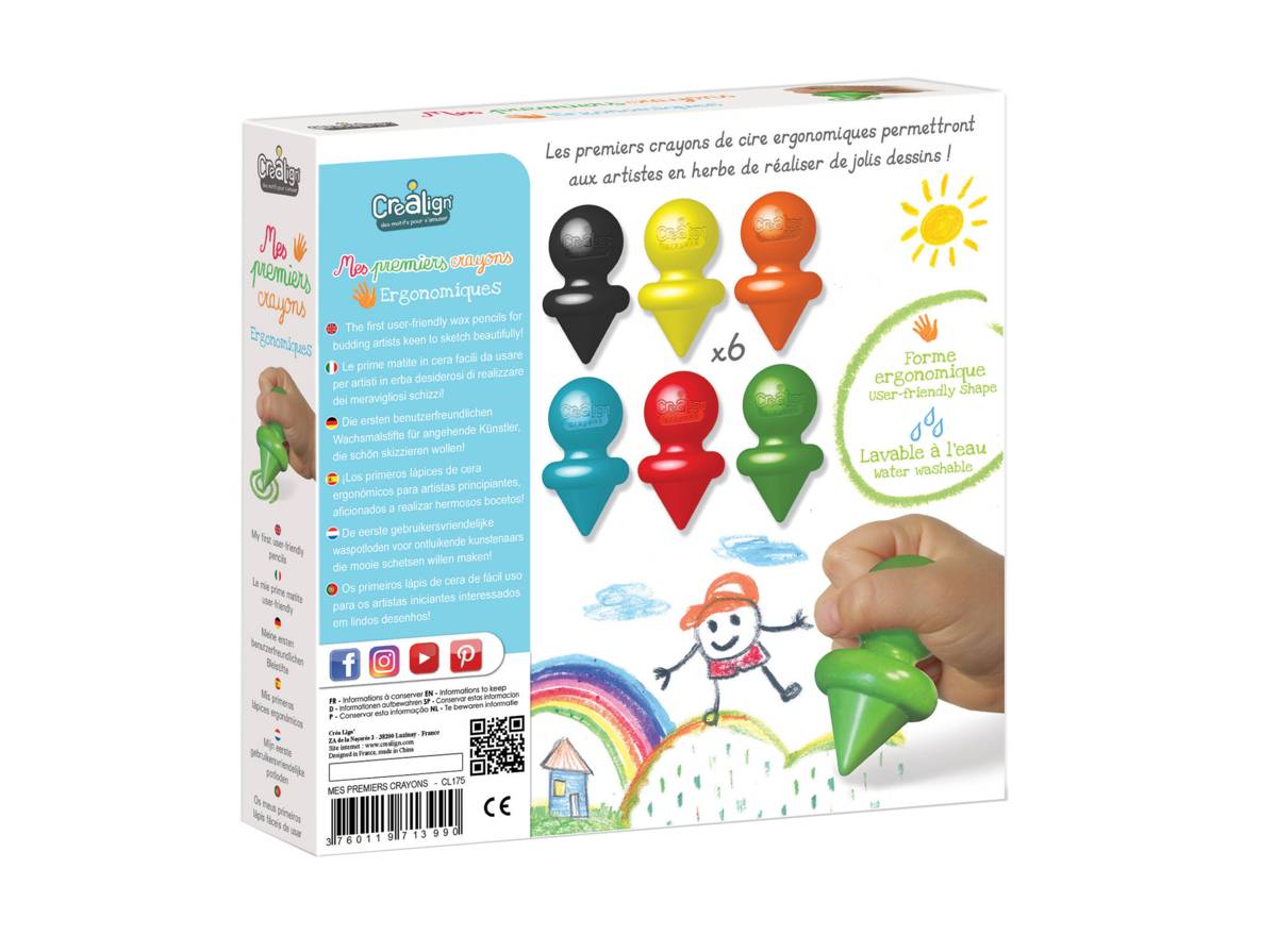 Ensemble de 6 crayons de cire de 7 cm composés d’une pyramide et d’une boule pour faciliter la prise en main.