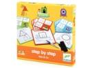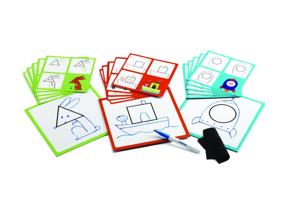 Ensemble qui comprend 3 tableaux lavables de 20 cm, 30 dessins à reproduire en 3 étapes, un crayon feutre effaçable et un bout de tissu. L'enfant choisit une forme (triangle, carré ou cercle), puis reproduit une image en suivant les étapes.