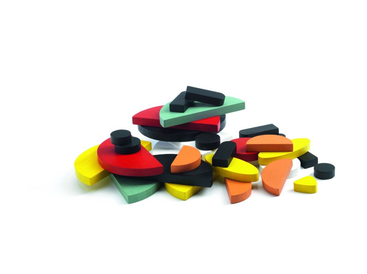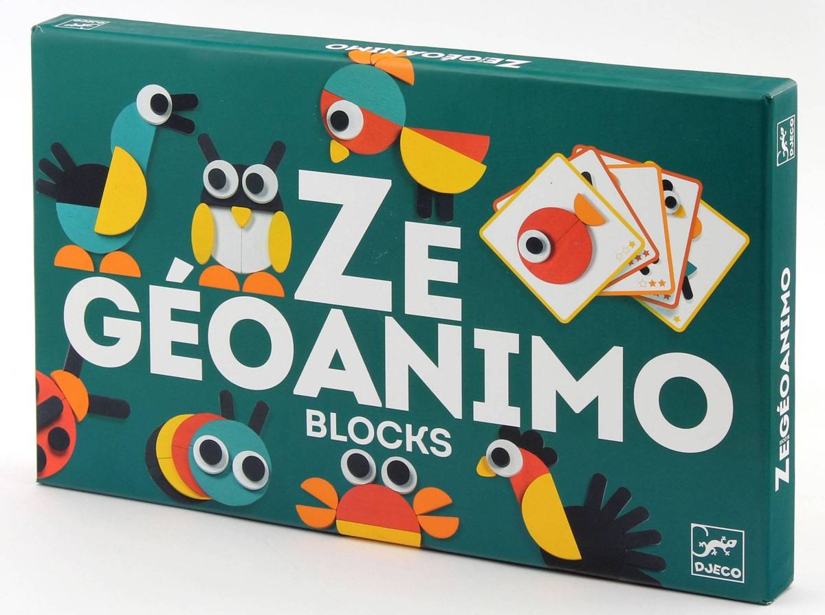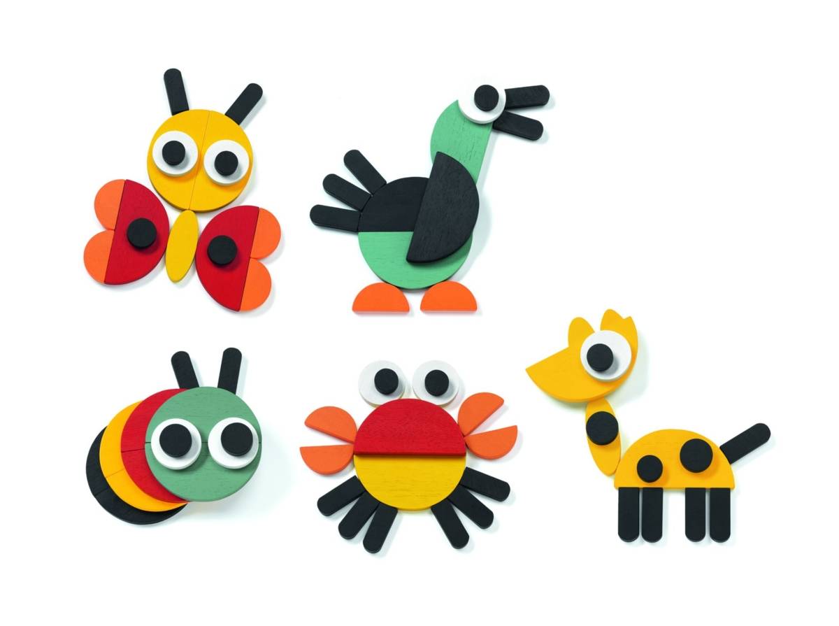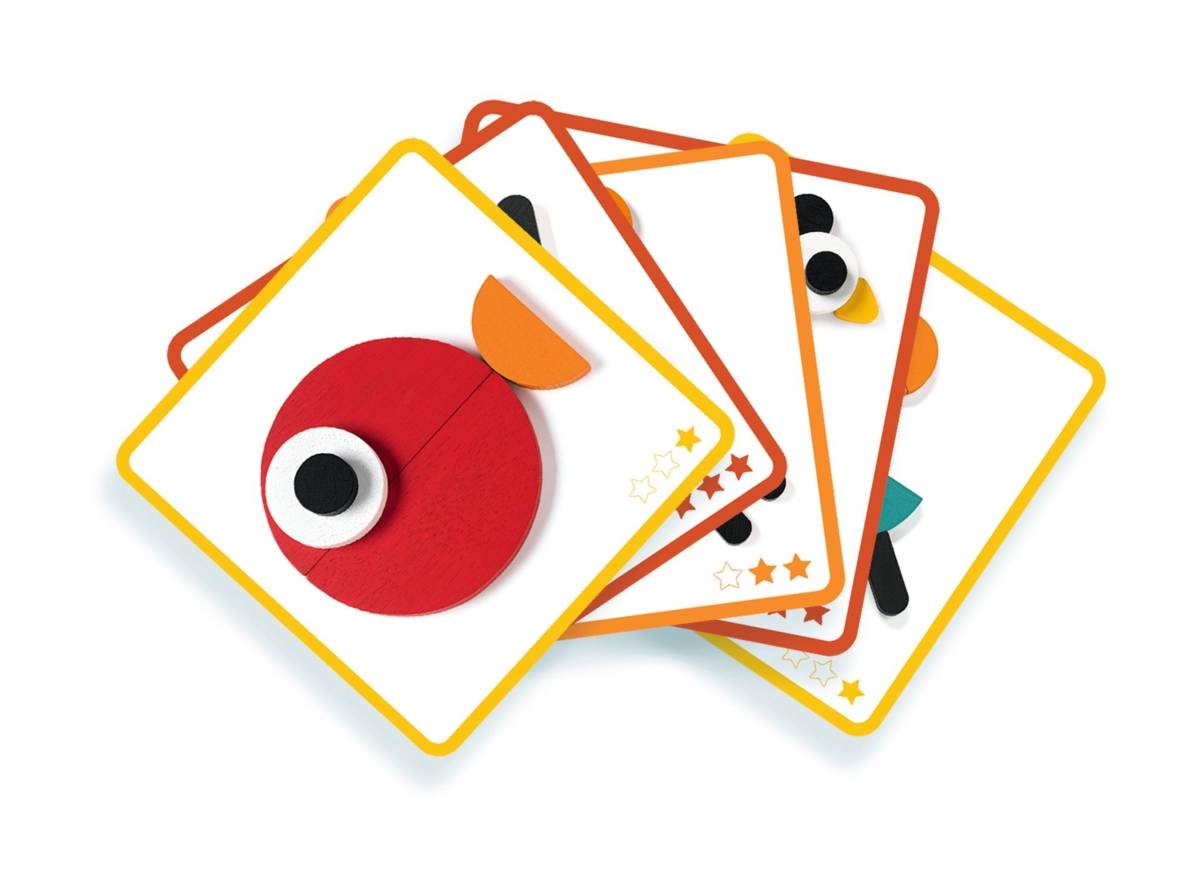 Jeu solitaire. Comprend 20 cartes illustrées d'animaux et 29 pièces en bois. L'enfant reproduit les animaux à l'aide des pièces. Trois niveaux de difficulté.