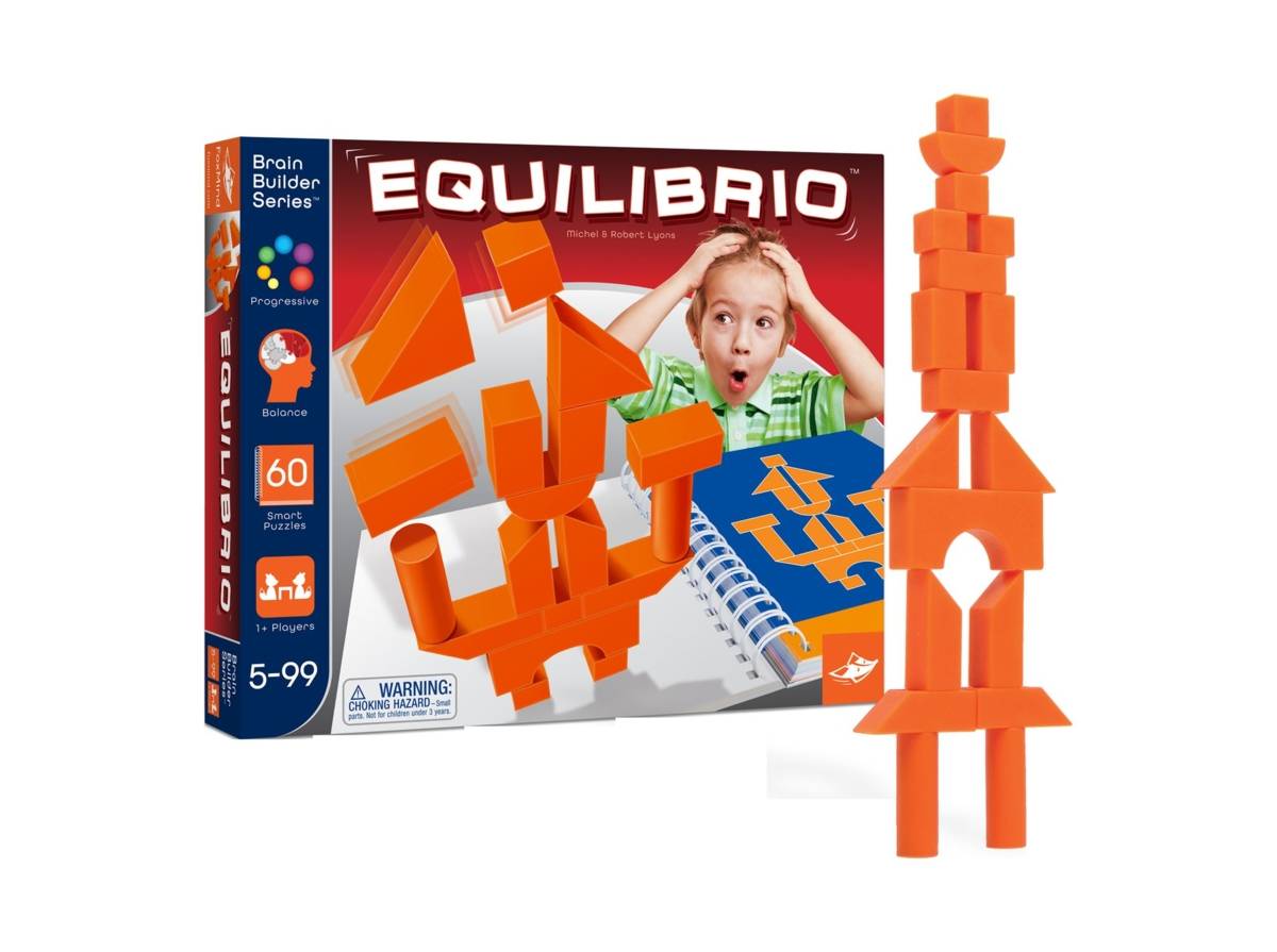 Jeu solitaire. Comprend 18 blocs en plastique de formes géométriques variées et un livret qui propose 60 modèles à 3 dimensions qui doivent tenir en équilibre.