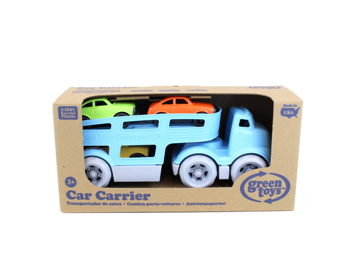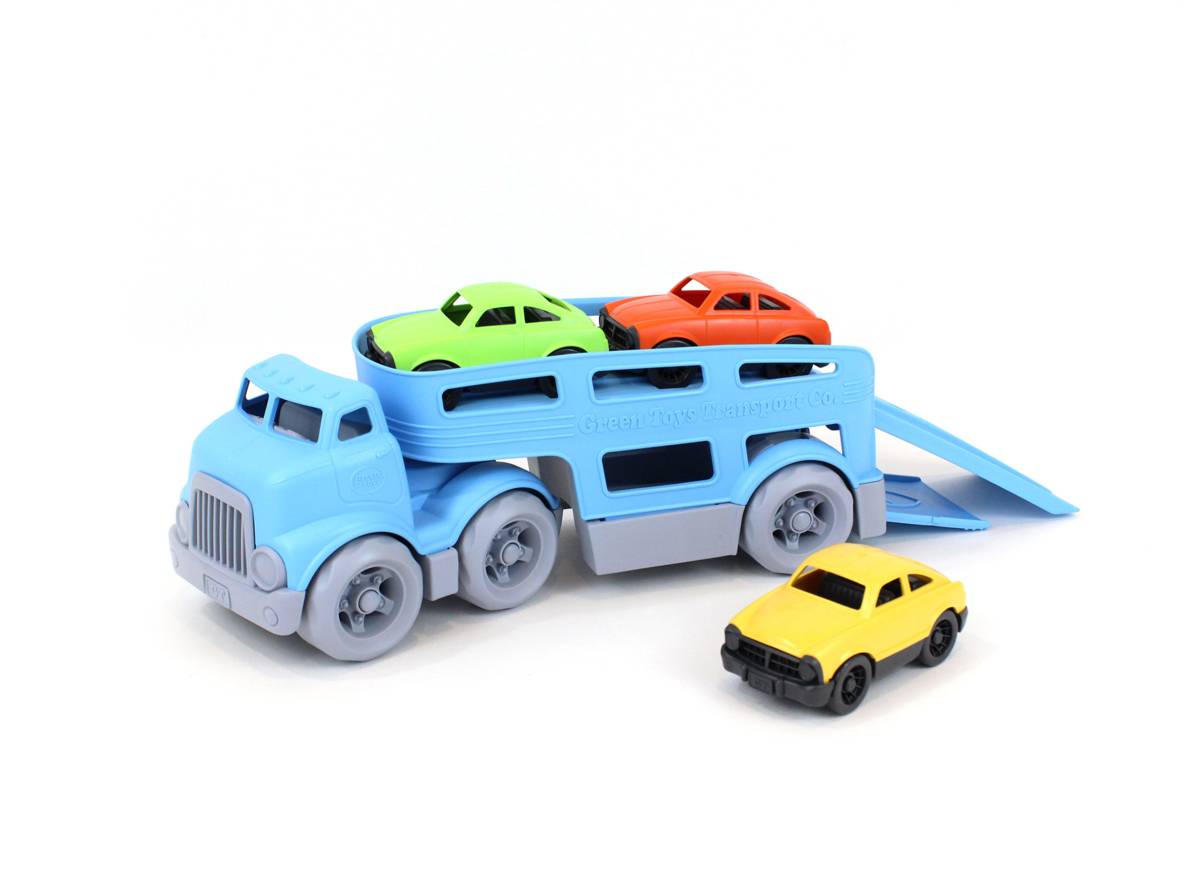 Ensemble de véhicules en plastique 100 % recyclé. Comprend un transporteur à 2 étages de 31 cm, une rampe d’accès et 3 autos de 10 cm.