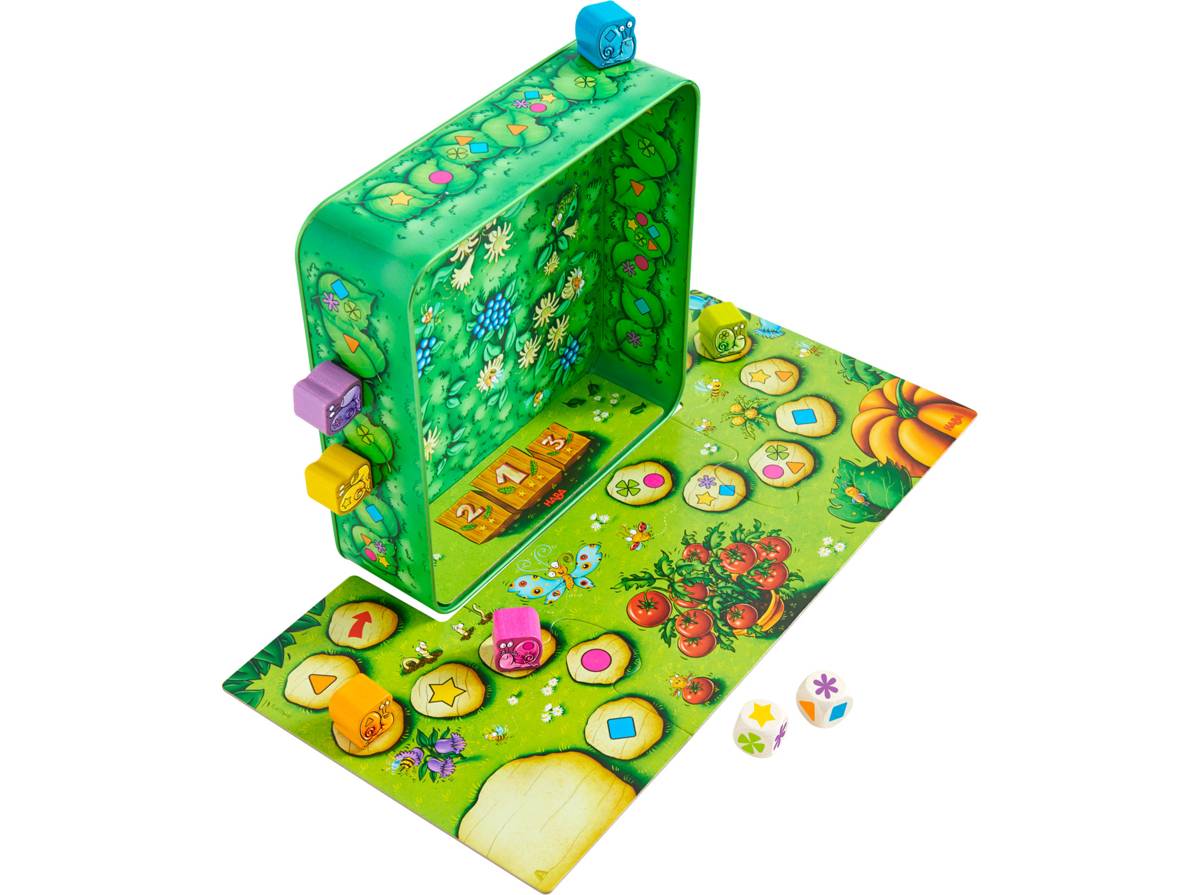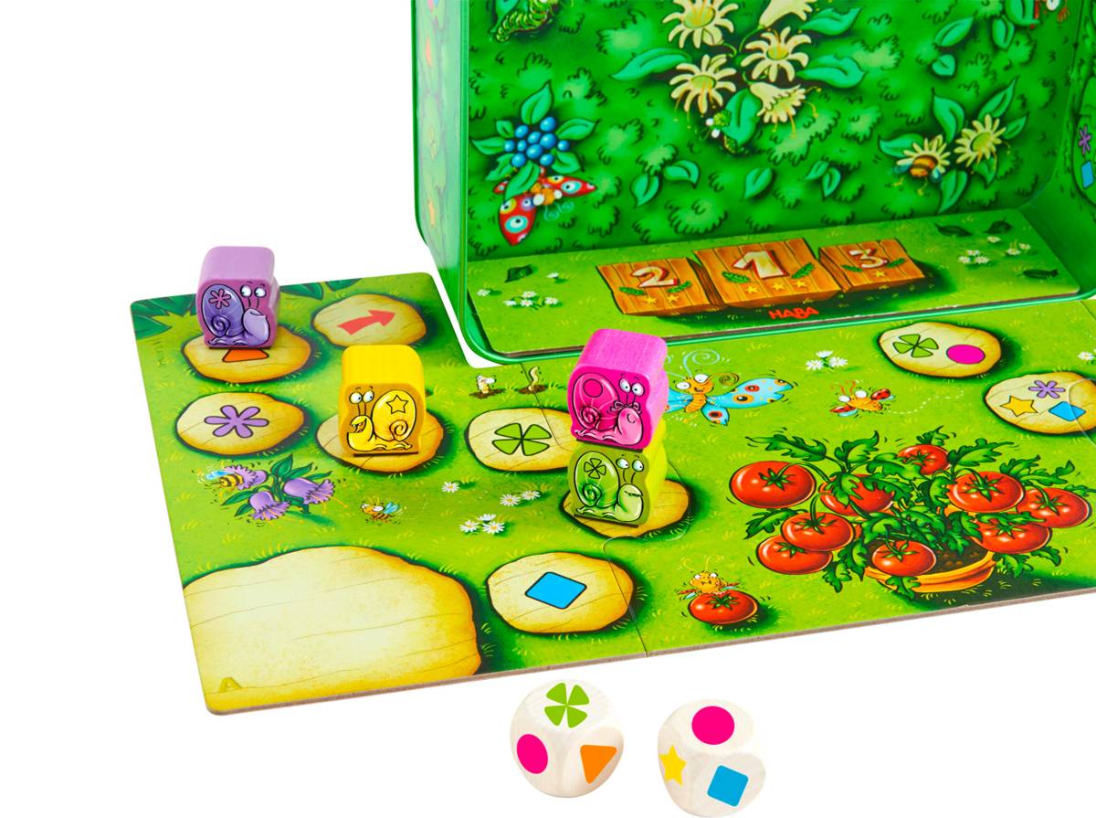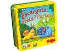 Jeu de parcours dans lequel se déroule une course d’escargots dans un potager. Au début de la partie, chaque joueur reçoit une carte de pari illustrant 3 des 6 escargots sur le podium. À son tour, un joueur lance les dés et choisit d’avancer un escargot selon le résultat obtenu. Mais attention, un escargot peut ramper sur un autre et l’empêcher d’avancer. La partie se termine lorsqu’il y a 3 escargots sur le podium. Les joueurs comparent leur carte au podium, celui qui a le plus de points gagne. Propose 2 parcours et une variante.