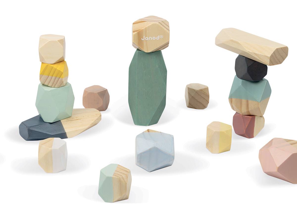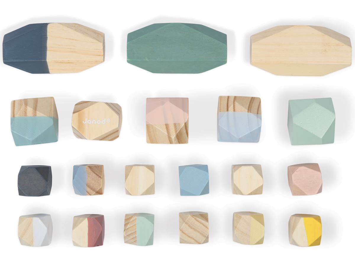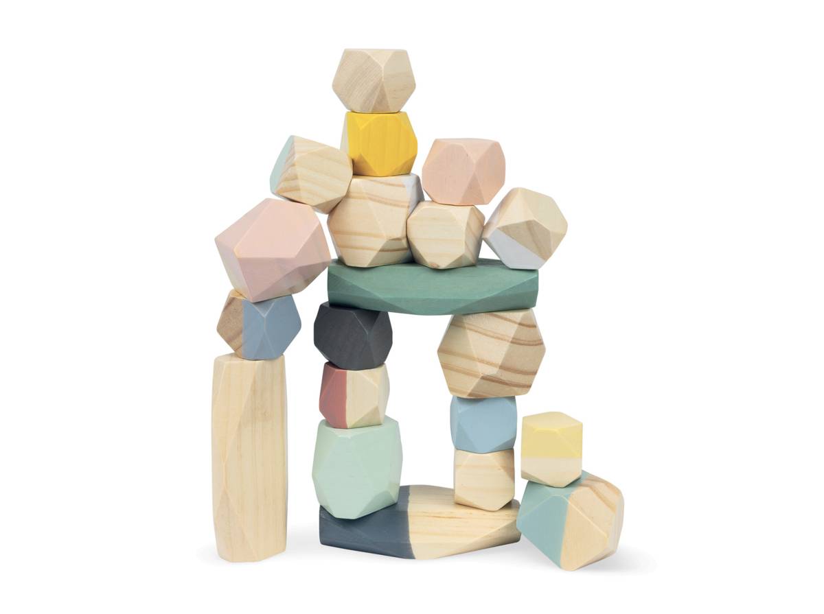 Beau visuel, couleurs douces et à la mode. Les blocs sont faciles et agréables à manipuler. Pour empiler les pièces, il faut toutefois une bonne motricité et un peu de patience, car il n’y a pas de tenon pour les faire tenir ensemble, ce qui décourage certains enfants. Par contre, ils sont nombreux à intégrer les pierres à leurs scénarios de jeu, pour représenter de la nourriture, des animaux, ou même pour simuler un déversement de cailloux. Jeu en bois solide et durable, et ce, malgré les nombreux lancers de cailloux.
