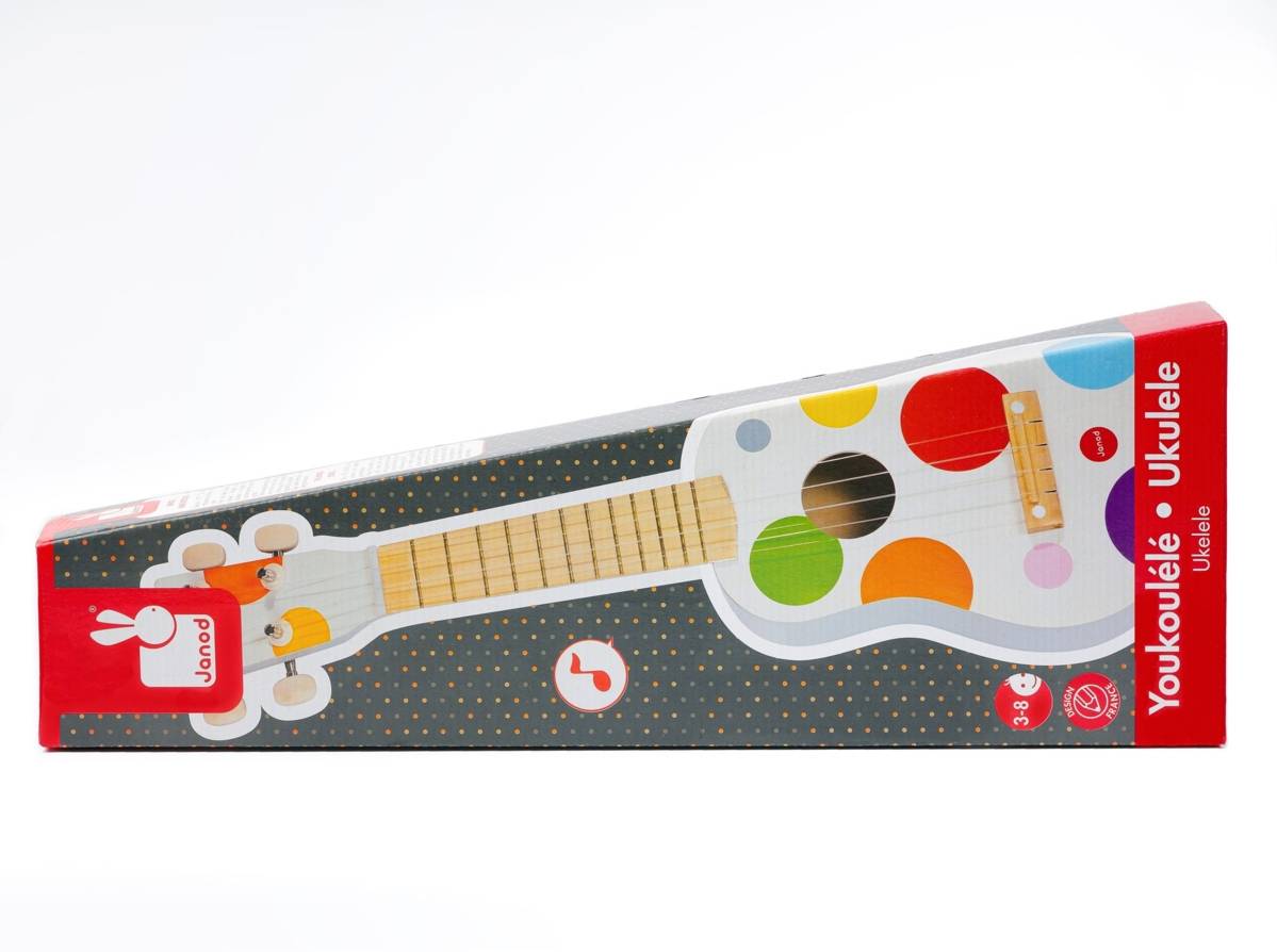 Ukulélé en bois de 53 cm aux motifs attrayants. L’instrument possède des cordes en nylon et des clés fonctionnelles. Toutefois, malgré les essais de notre experte, il est pratiquement impossible d’accorder l’instrument, et donc impossible d’apprendre ou de jouer une pièce.