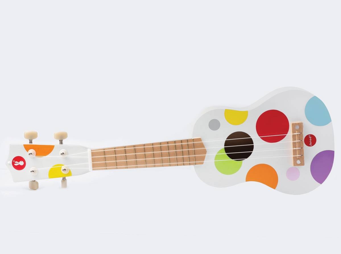 - Ce produit de la collection Confetti de Janod se trouve parmi les «jeux d’imitation» sur le site web du fabricant. La collection propose d’autres instruments reprenant les mêmes motifs.