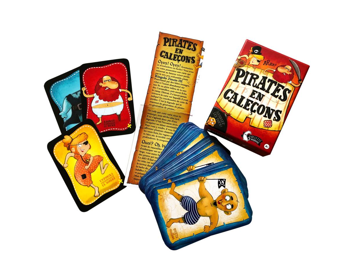 Jeu de cartes dans lequel, pour gagner, le joueur doit être le premier à recruter et à vêtir 3 pirates. À son tour, l’enfant pige une carte et se défausse d’une. Lorsqu’il réussit à terminer un ensemble (pirate, chapeau, vêtements et bottes), il peut crier « Arrr ! » et déposer les cartes devant lui ou les garder pour plus tard. Comprend 67 cartes, dont 7 spéciales, qui pimentent la partie. Propose une variante pour les plus jeunes.