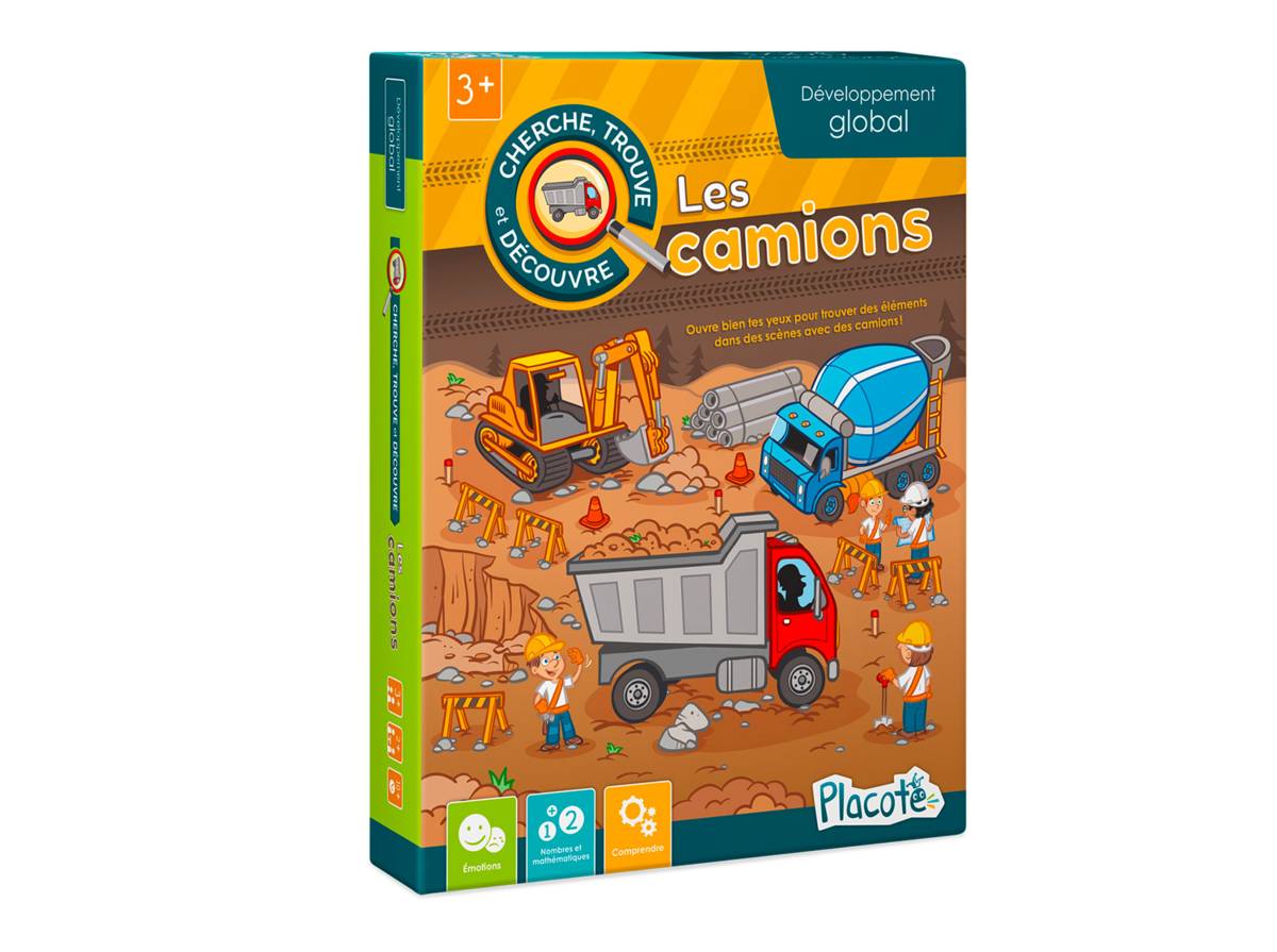 Jeu pédagogique « 5-en-1 » sur le thème des camions. Comprend 4 planches de jeu illustrées et 60 cartes. Propose 5 jeux différents et une variante pour 4 d’entre eux. L’enfant apprendra à compter de 1 à 5, à nommer ses émotions et leurs causes (peur, tristesse, colère, etc.), à comprendre des consignes sur la couleur ou la taille des objets, à développer ses habiletés sociales et son sens de l’observation. Nécessite la participation d’un adulte pour faciliter les apprentissages.