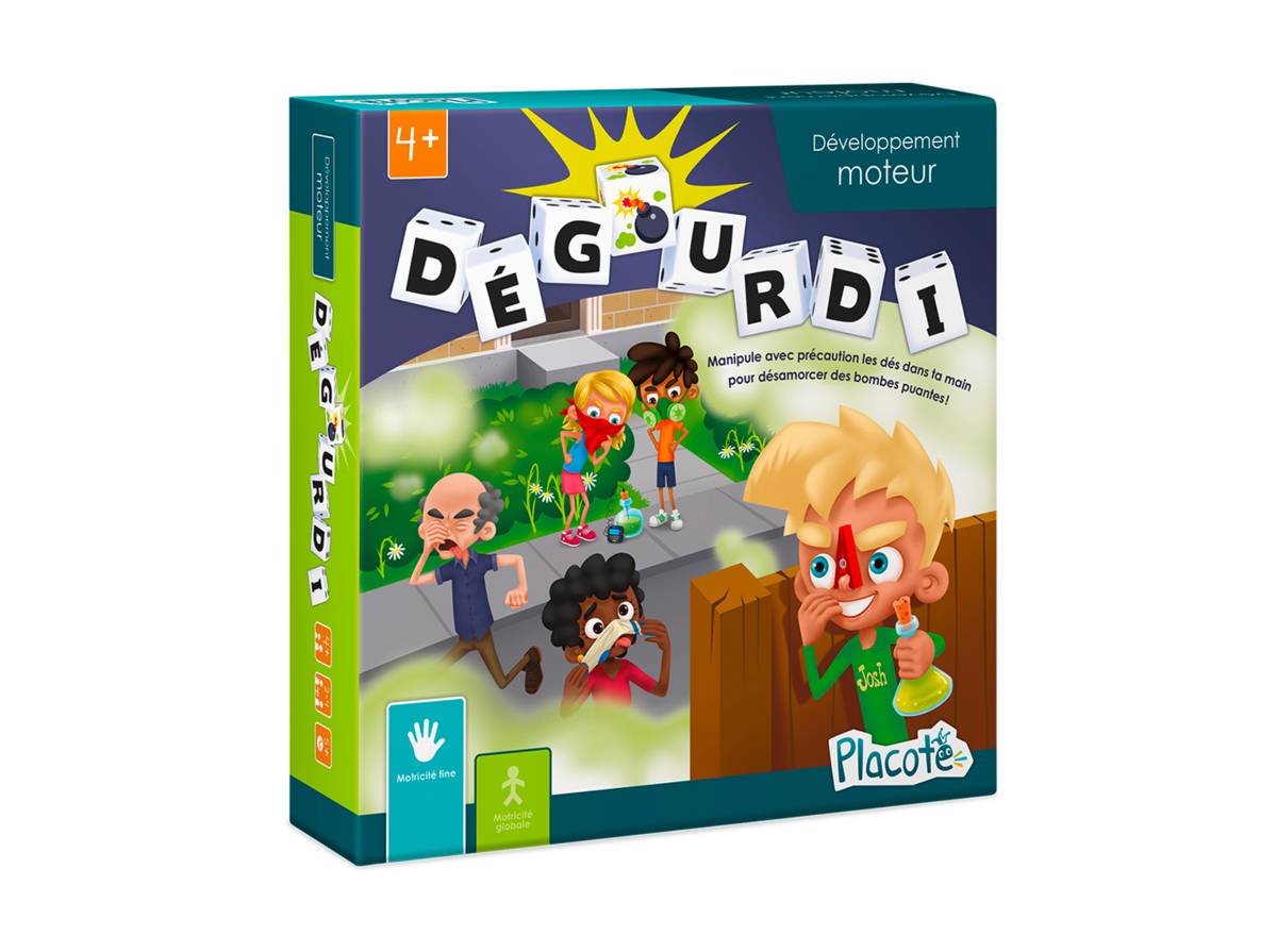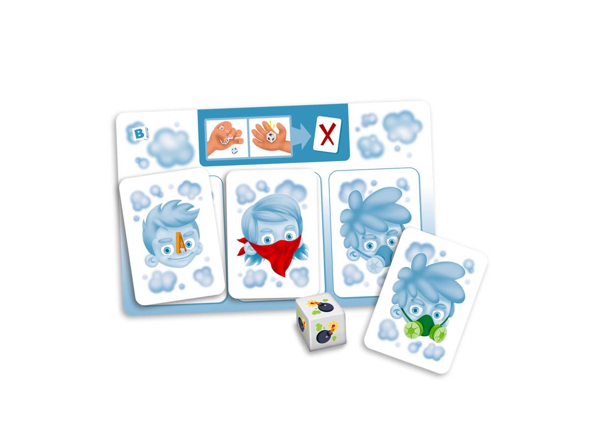 Jeu d’adresse pédagogique dans lequel le joueur doit désamorcer des bombes puantes en empilant 3, 4 ou 5 dés selon l’ordre et le sens affiché sur ses cartes. Attention, pour réussir, il ne doit les manipuler que d’une seule main. Le joueur qui a le plus de points remporte la partie. Propose 2 jeux (dont un de rapidité), 3 niveaux de difficulté ainsi que 4 variantes. Minuterie non comprise.