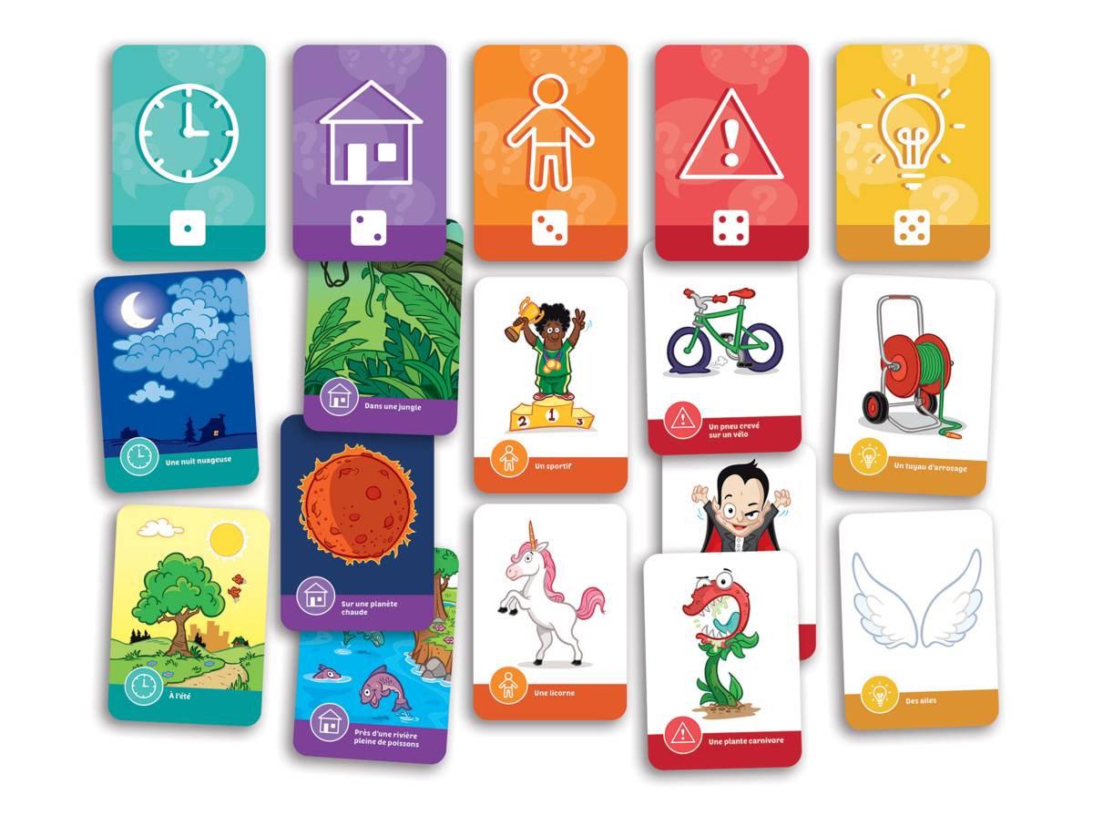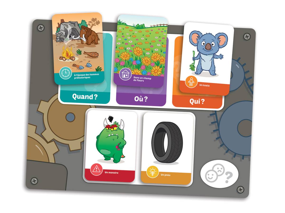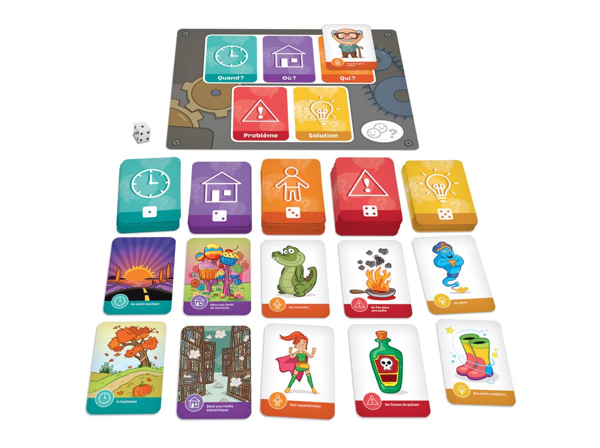 - Durée de la partie : environ 20 minutes, selon la longueur des histoires. Pour de 2 à 4 joueurs. Permet de développer le langage, le vocabulaire, la narration, la logique, l’organisation de la pensée et l’imaginaire. Propose 2 niveaux de difficulté et 3 variantes. Jeu québécois.