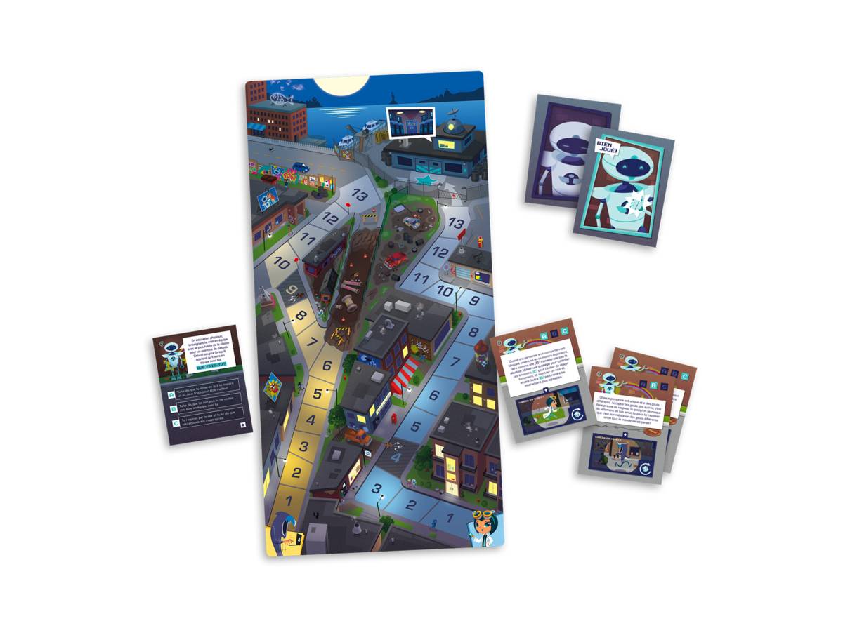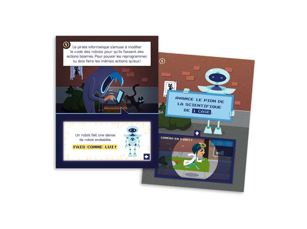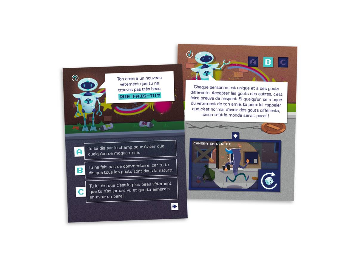 Jeu de société coopératif dans lequel les joueurs doivent aider la scientifique en chef à atteindre l’entrepôt secret avant le pirate informatique qui menace de reprogrammer tous les robots. À chaque tour, l’adulte lit une mise en situation et un choix de 3 réponses. L’enfant doit alors déterminer le ou les bons comportements parmi le choix des réponses énoncées, puis faire avancer le pion de la scientifique ou du pirate. Comprend 84 mises en situation. Nécessite la participation d’un adulte pour favoriser les apprentissages.