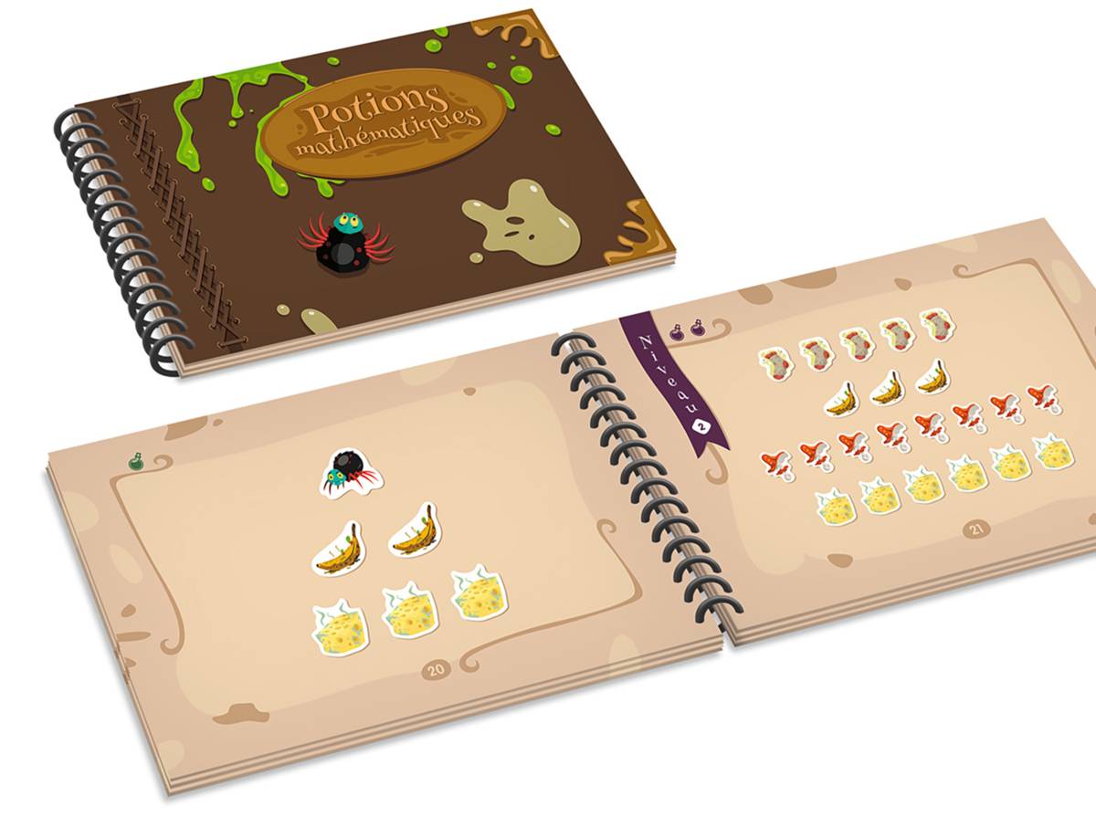 Jeu divertissant idéal pour initier les enfants aux mathématiques de façon amusante. L’enfant se transforme en apprenti sorcier et doit compléter la recette d’une potion en comptant les ingrédients farfelus nécessaires (bananes pourries, chaussettes qui puent, etc.). Il apprend ainsi à compter et à reconnaître les nombres écrits de 1 à 10.