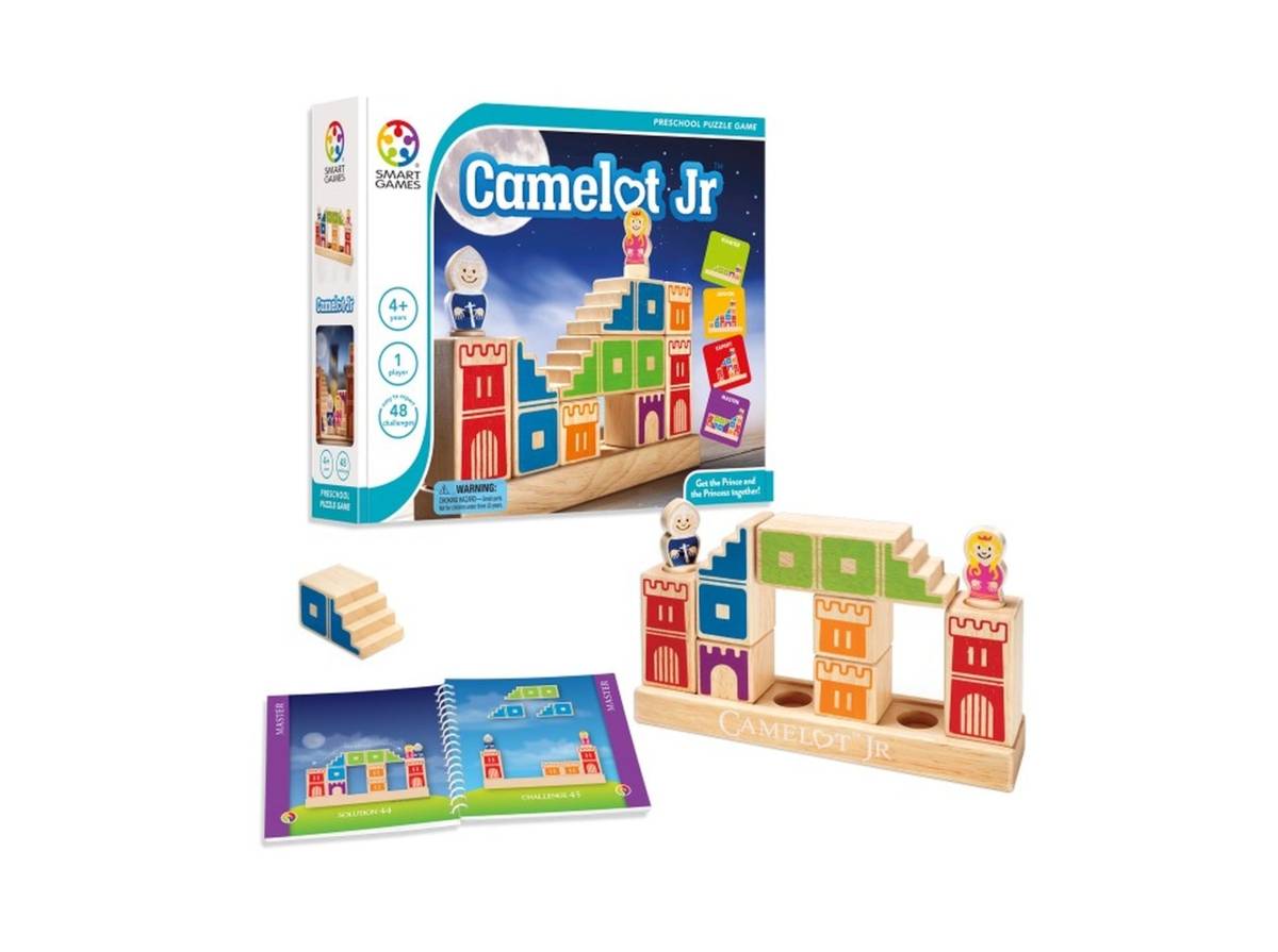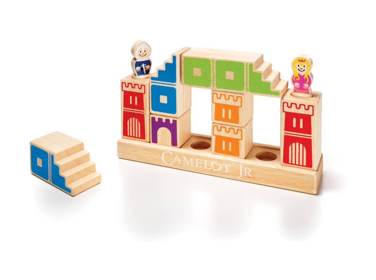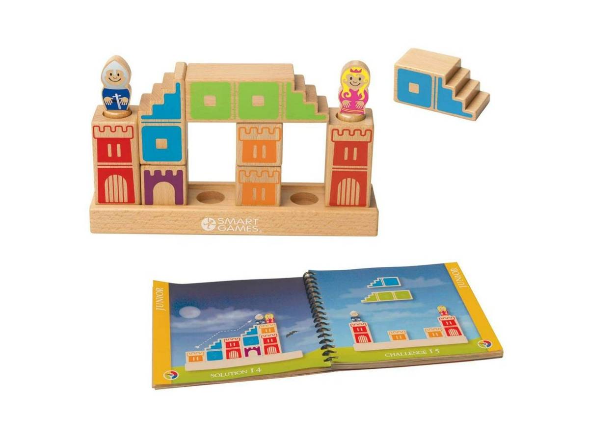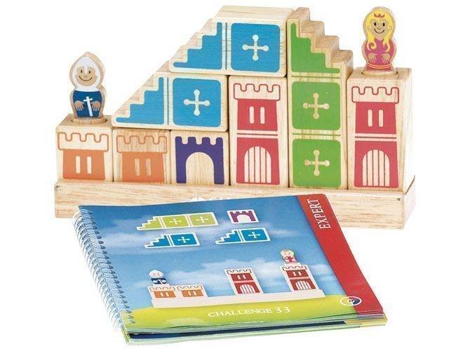 Jeu de patience en bois. Comprend 8 blocs qui forment un château, un support et 2 figurines. L'enfant place le chevalier et la princesse sur les 2 extrémités du support, puis cherche la bonne combinaison de blocs pour qu'ils puissent se rejoindre. Offre 48 problèmes de 4 niveaux de difficulté.