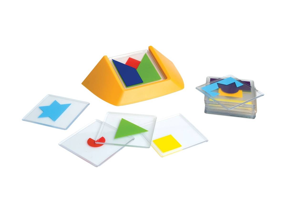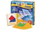 Jeu de patience solitaire. Comprend un support et 18 plaques en plastique illustrées de différentes formes géométriques de couleurs diverses et un livret contenant 100 problèmes de 4 niveaux de difficulté. Le but est de reproduire l'image présentée dans le livret.