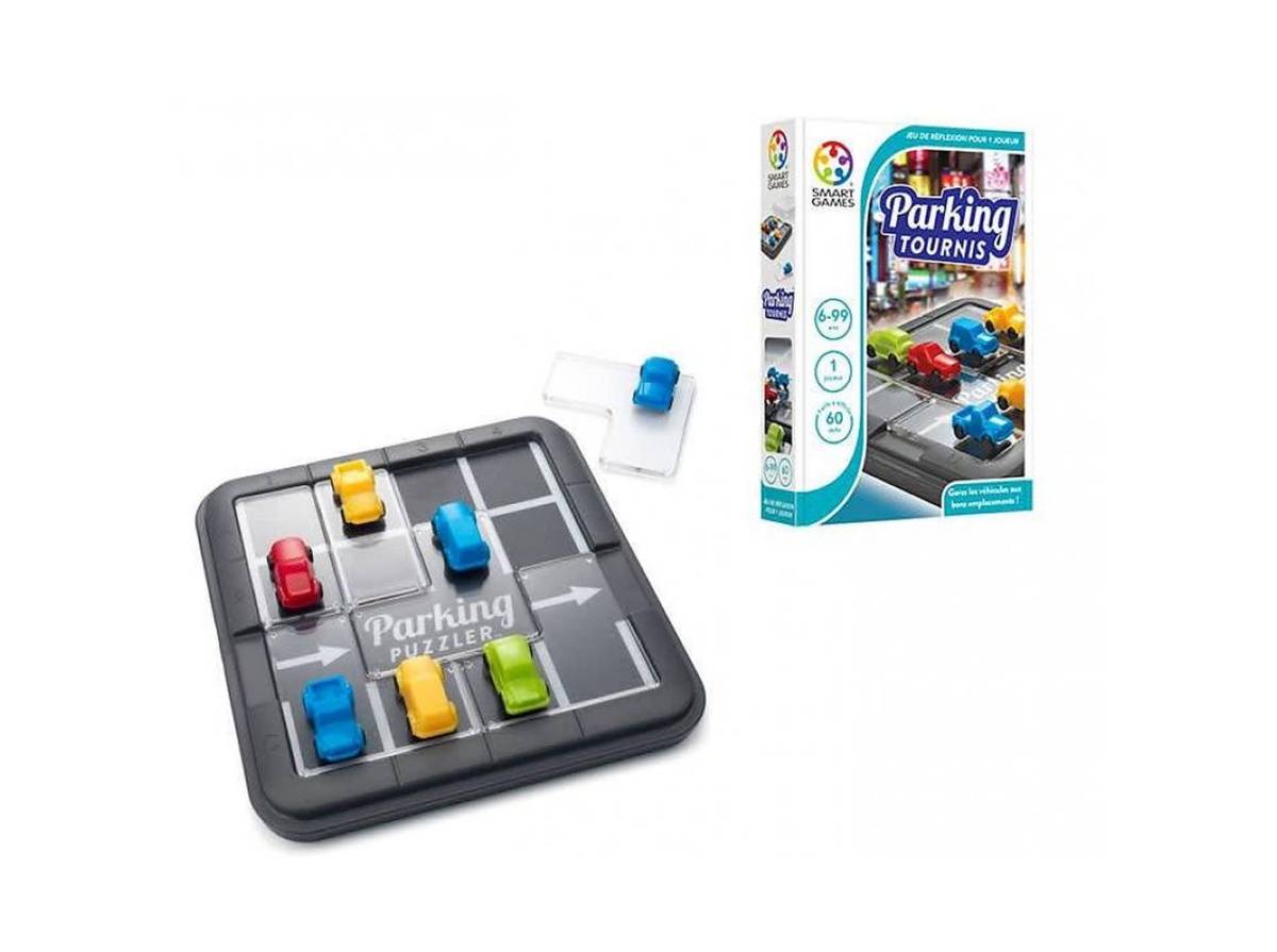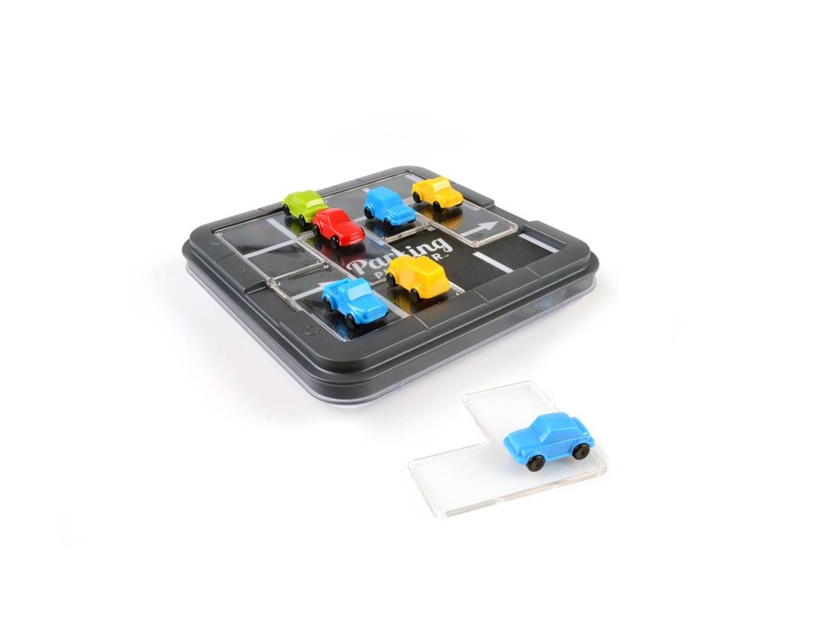 Jeu solitaire en plastique. Comprend un plan de jeu et 7 véhicules sur 6 plaquettes. Le joueur choisit un des 60 défis à résoudre en stationnant les voitures. Quatre niveaux de difficulté.