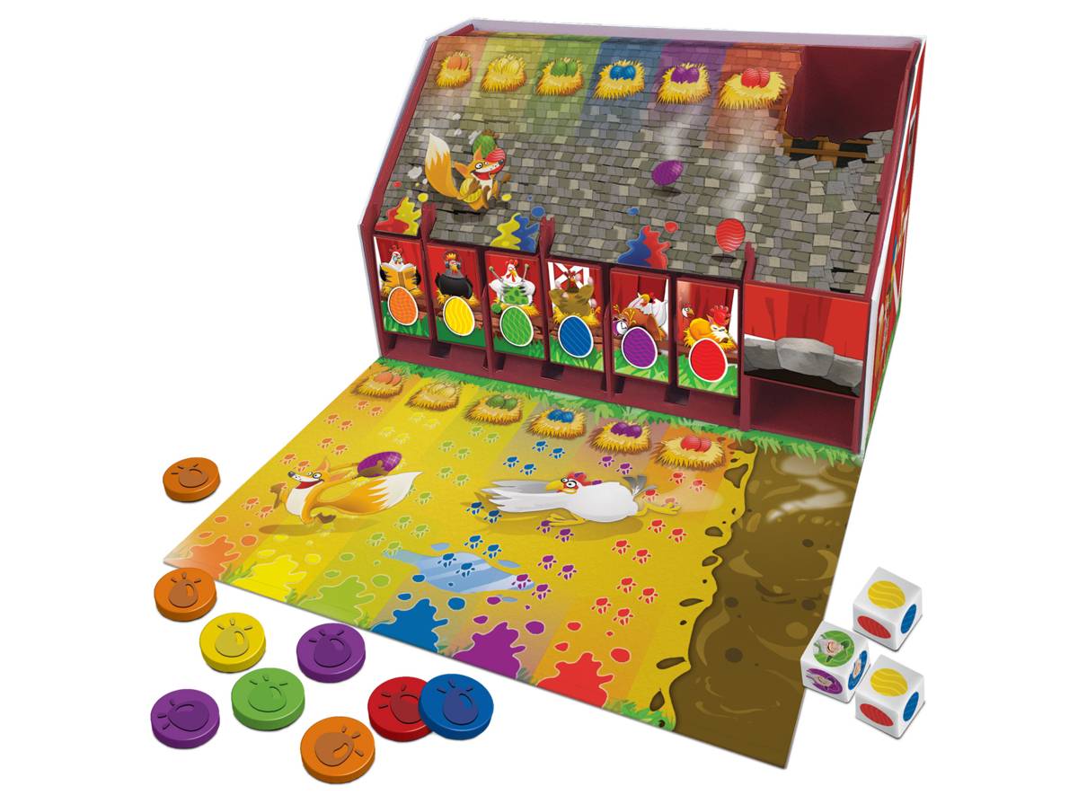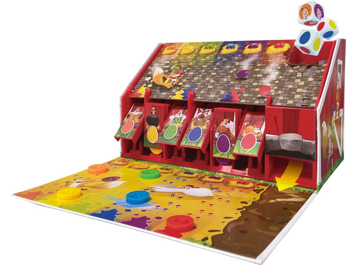 Jeu de style « Stop ou Encore » (ou de prise de risque). À son tour, le joueur fait rouler les dés dans la cheminée du poulailler, puis réserve un œuf selon les couleurs indiquées par les dés. Il doit ensuite soit relancer les dés pour obtenir plus d’œufs de couleurs différentes, soit s’arrêter. Le premier à récupérer 10 œufs remporte la partie. Propose une variante pour les plus jeunes.