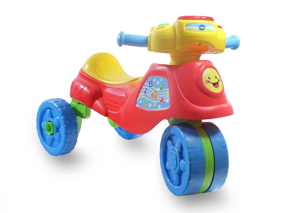 Tricycle de 65 x 40 cm en plastique. Se transforme en moto. L’enfant s’assoit dessus et se propulse à l’aide de ses pieds. Propose 15 mélodies, 3 chansons, des sons et des énoncés. Offre 2 modes de jeu : musique et découverte.