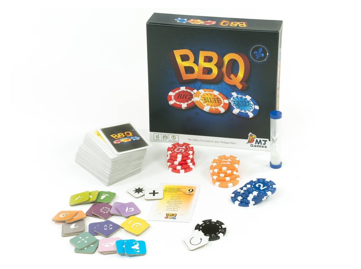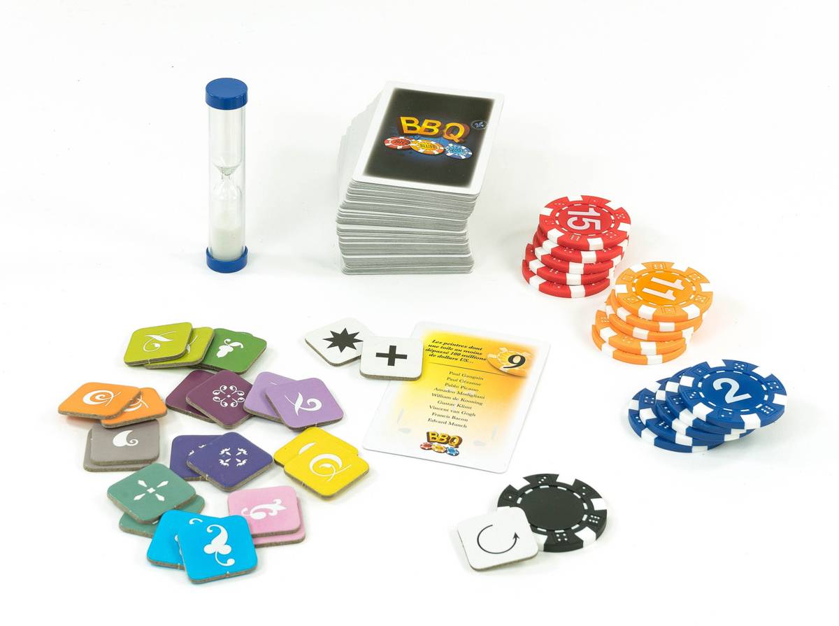 - 109 cartes comprenant 218 questions, 1 carte Dessus de pile, 16 jetons de poker en 4 couleurs, un sablier d’une minute, 22 jetons colorés et 3 blancs.