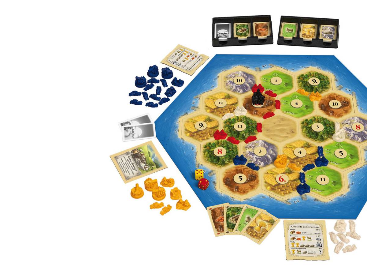 - 37 plaquettes qui servent de plan de jeu, 95 cartes-ressources, 96 pièces qui représentent des colonies, des villes et des routes, etc.