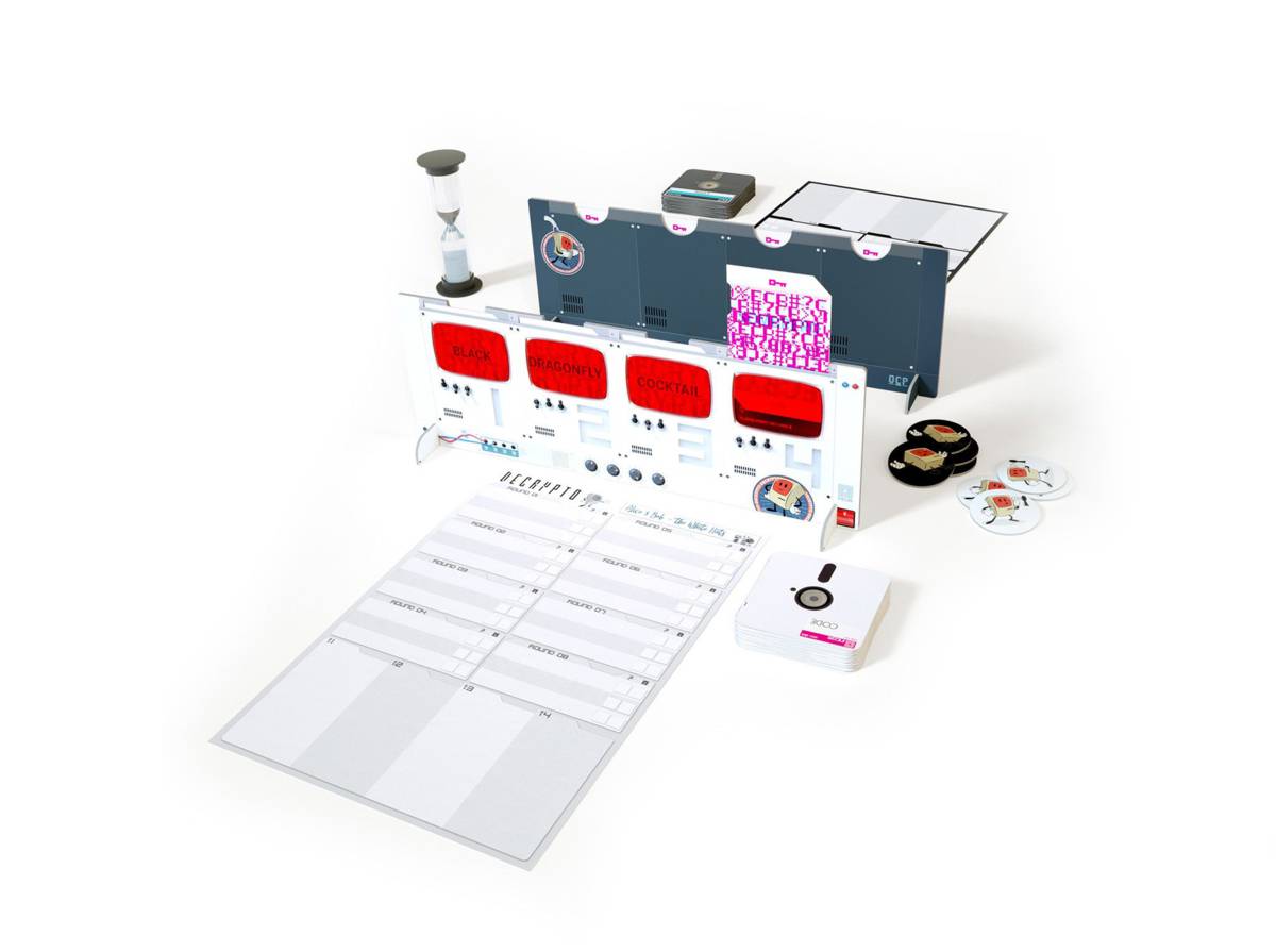 - 2 écrans, 48 cartes Code en 2 paquets, 110 cartes Mots-clés, 4 jetons Interception, 4 jetons Malentendu, 50 feuilles de notes et un sablier.