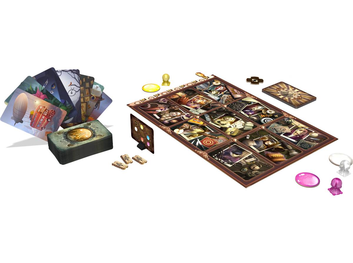 - 84 cartes Vision, 60 cartes Intrigue, 3 jetons Ticket, un plateau, 20 cartes Personnage, 20 cartes Lieu, 5 jetons Innocent, 5 jetons Intuition, un jeton Témoin, un jeton Compte-tours et un support pour les cartes Intrigue.