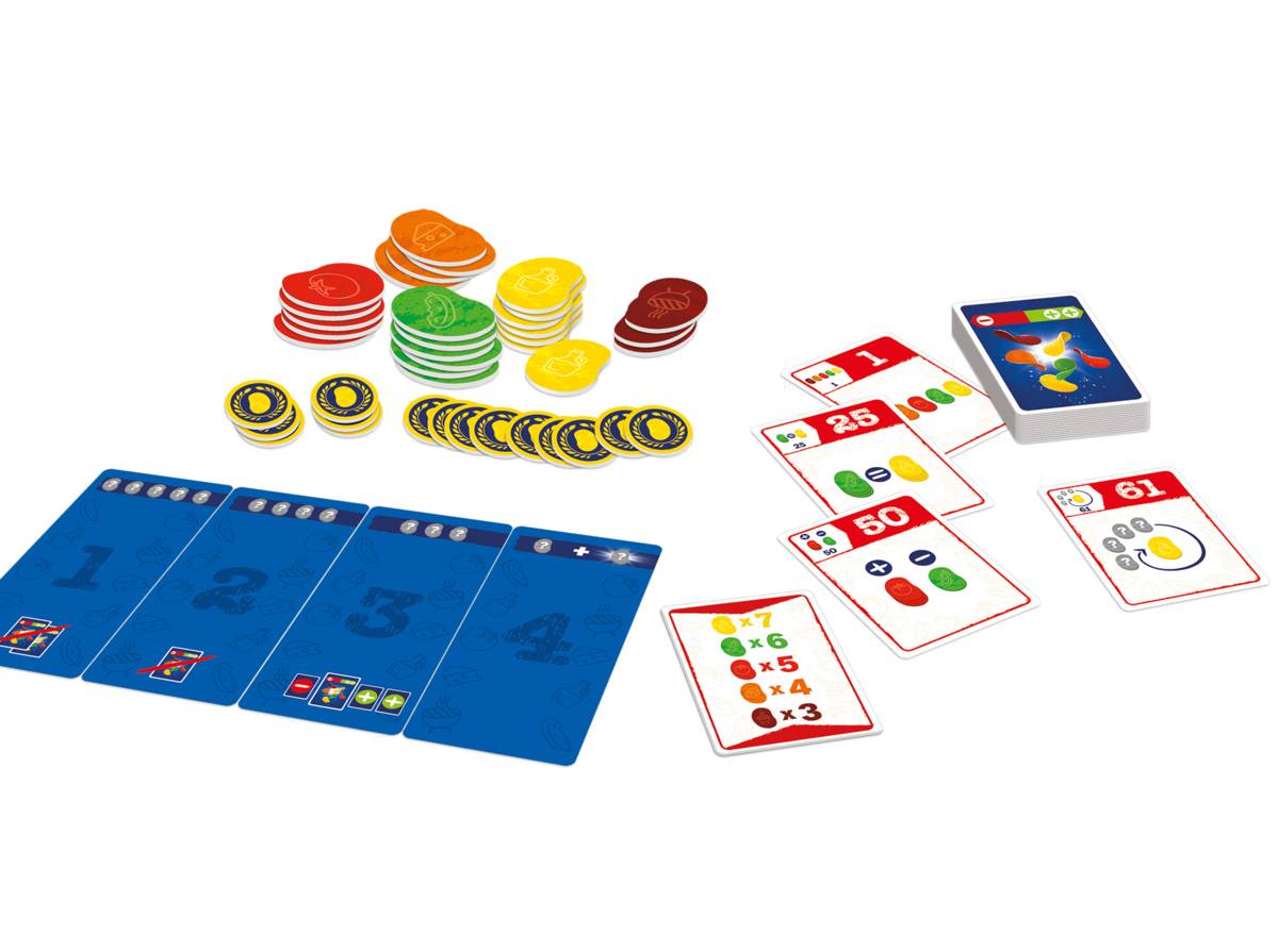 - 36 cartes Objectif, 4 cartes Plateau, 25 jetons Chips de cinq couleurs différentes, 16 jetons de victoire, 1 sac de chips et 1 carte récapitulative.