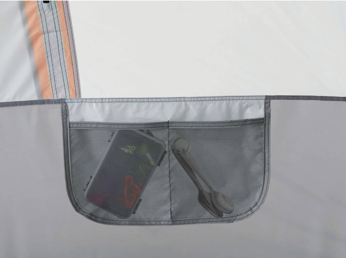 - Auvent à l'entrée, pochettes de rangement, crochet au plafond pour suspendre une lampe, passage pour rallonge électrique