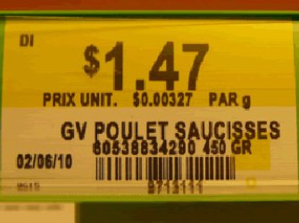 Le prix correspondant à l’unité de mesure n’apparaît pas pour le prix courant. De plus, l’étiquette indique deux prix en solde, mais seul celui de droite possède un prix correspondant à l’unité de mesure. |