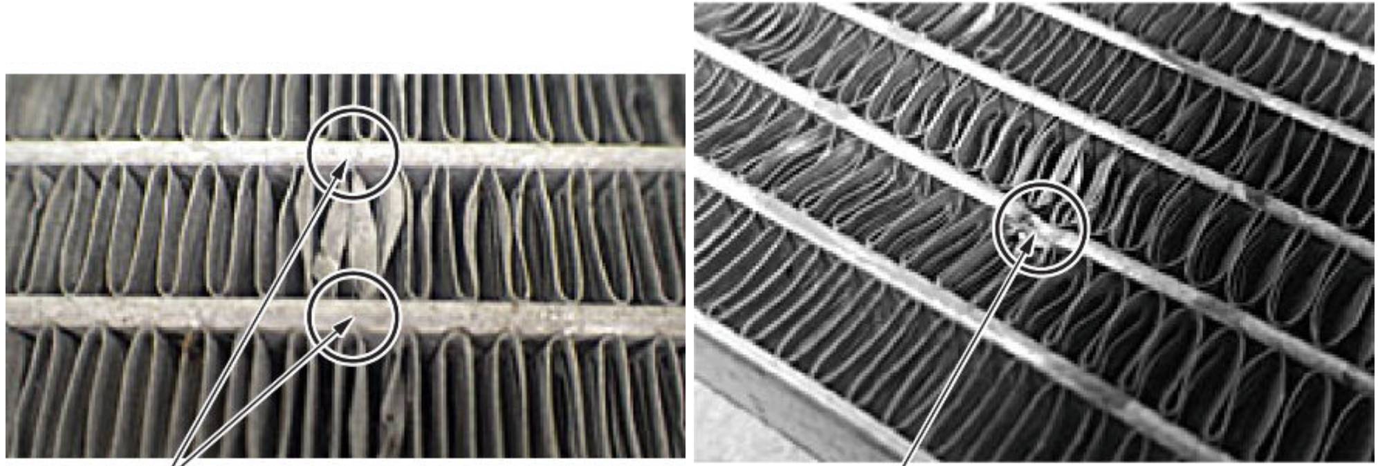 - À gauche : le dommage imputable à une projectile sur la route n'a pas atteint les conduits du condenseur. La fuite serait couverte par la prolongation de la garantie. À droite : le conduit du condenseur a été endommagé par un projectile sur la route. Dans ce cas, la prolongation de la garantie ne s’applique pas. Photos extraites d’un bulletin technique de Honda envoyé aux concessionnaires américains.