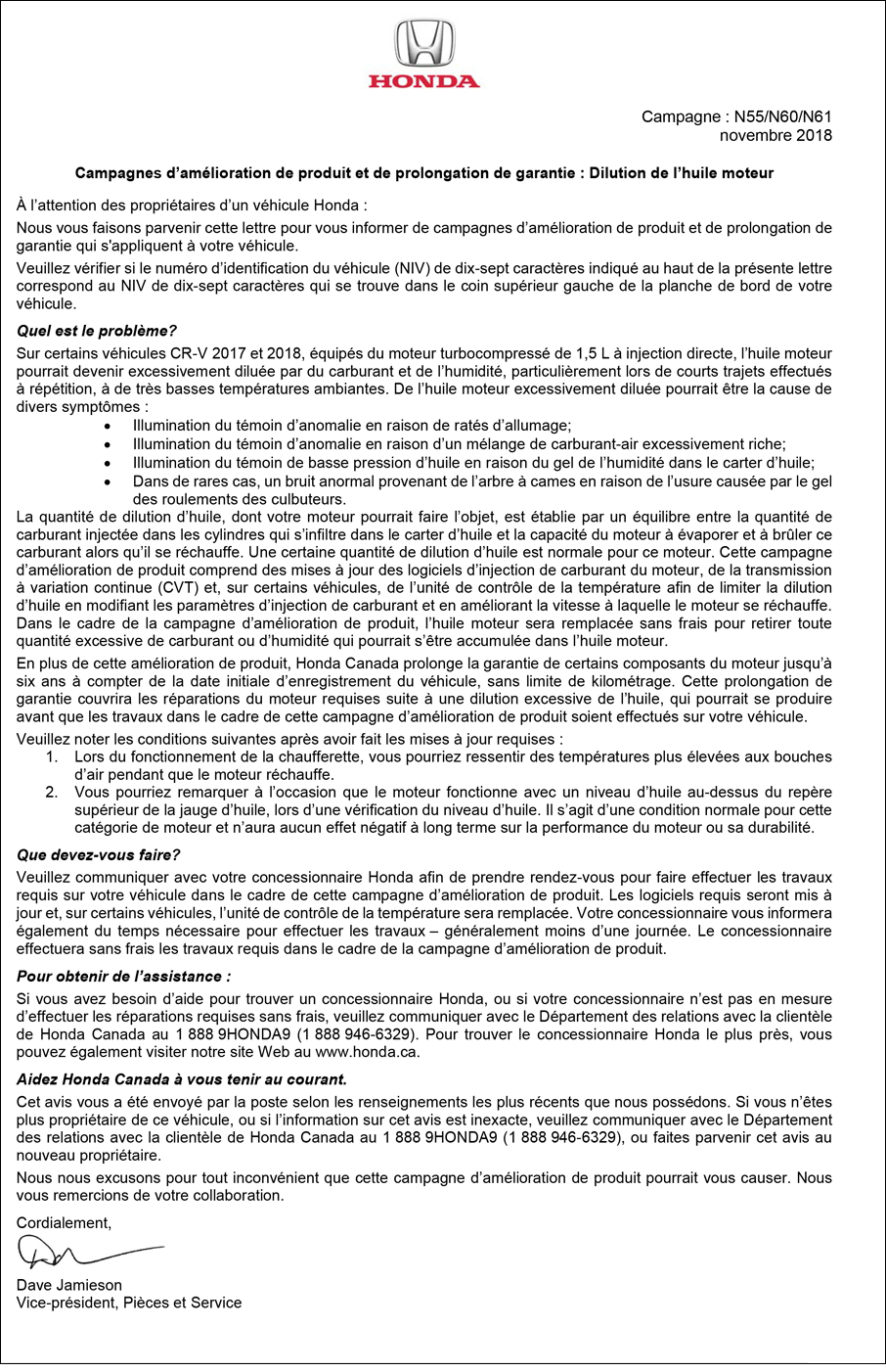 Nous avons contacté Honda Canada pour connaître leur point de vue. Ils nous ont expliqué avoir commencé à informer les propriétaires au début de mois de novembre 2018 et ont déjà débuté les modifications sur les véhicules. Selon le constructeur, plus de 14 000 consommateurs québécois ont déjà reçu une lettre leur demandant de se rendre chez leur concessionnaire.
