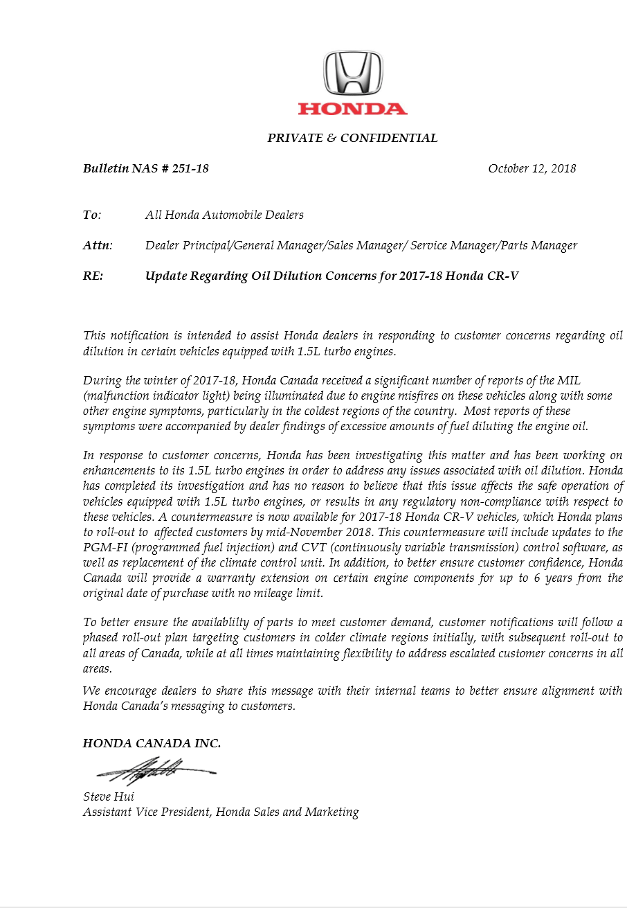Dans une note confidentielle datée du 12 octobre 2018 (voir ci-dessous), Honda Canada informe ses concessionnaires qu’un programme de réparation sera mis en place pour les Honda CR-V 2017-2018.