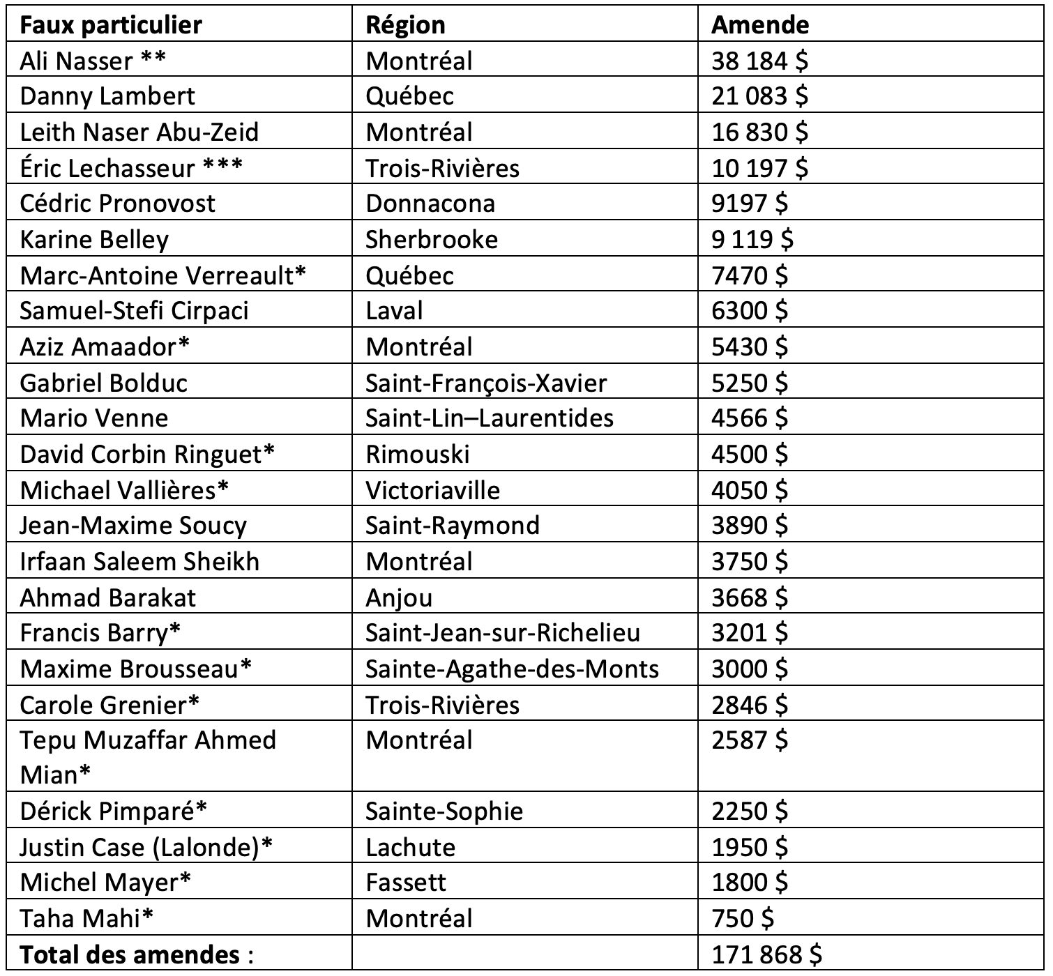 Certains sont rendus à plusieurs démêlés avec la justice concernant leurs opérations illégales. Parmi eux, M. Ali Nasser, de Montréal : ce faux particulier a de nouveau été déclaré coupable en décembre 2022 pour 20 chefs d’accusation, ce qui lui a valu des amendes records de presque 40 000 $. Le récidiviste avait continué de vendre des véhicules d’occasion même s’il se trouvait déjà sous le coup d’une injonction permanente de la Cour supérieure du Québec. En effet, après avoir été déclaré coupable en 2019 de 11 infractions pénales (et écopé de près de 12 000 $ d’amendes), le plus haut tribunal lui avait ordonné de cesser de mener pareil commerce (sans le) permis requis et de ne plus altérer l’odomètre de véhicules routiers.