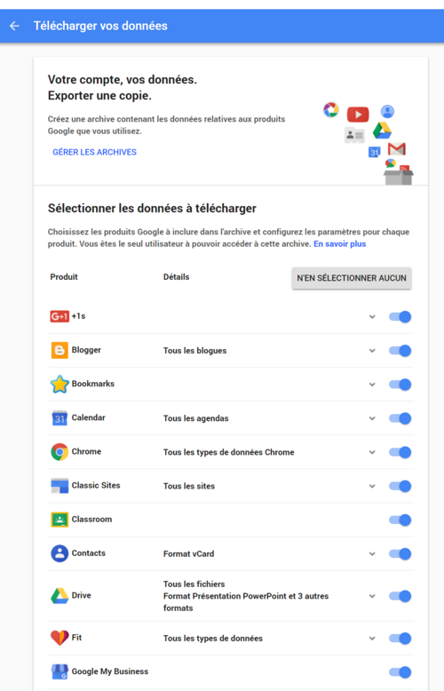 Google Takeout affiche tous ses services qui permettent de télécharger vos données : Chrome (vos signets et votre historique), Agenda (vos rendez-vous passés et à venir), Contacts (les coordonnées de vos proches, amis et collègues), Drive (vos fichiers personnels sauvegardés en ligne), etc. Laissez tomber les services pour lesquels les données sont moins importantes, par exemple YouTube et les commentaires que vous y avez laissés au fil des ans.