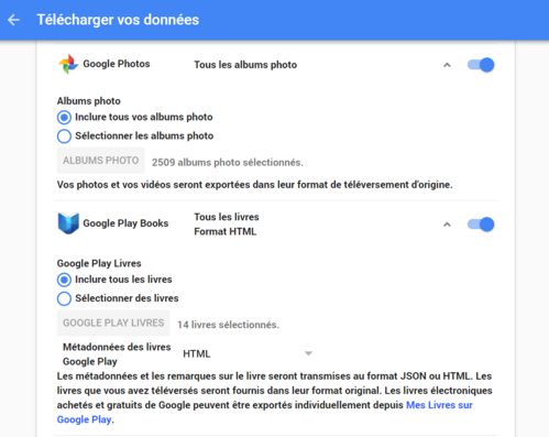 Pour chaque service, appuyez sur la flèche vers le bas qui permet dans certains cas de sélectionner des données précises. Si vous utilisez Google Photos, par exemple, vous pouvez télécharger toutes vos images ou seulement un album en particulier.