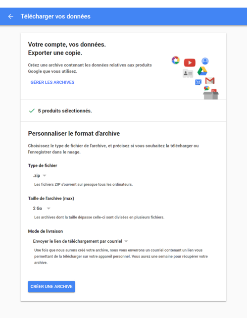 Appuyez sur le bouton « Suivant » au bas de la page pour personnaliser le format d’archive et choisir votre mode de livraison. Si vous souhaitez obtenir une copie sur votre ordinateur, vous recevrez un lien de téléchargement par courriel. Il est également possible de téléverser vos données automatiquement sur un autre compte en ligne, comme Dropbox ou OneDrive (à lire sur notre site: notre test de services de sauvegarde en ligne).