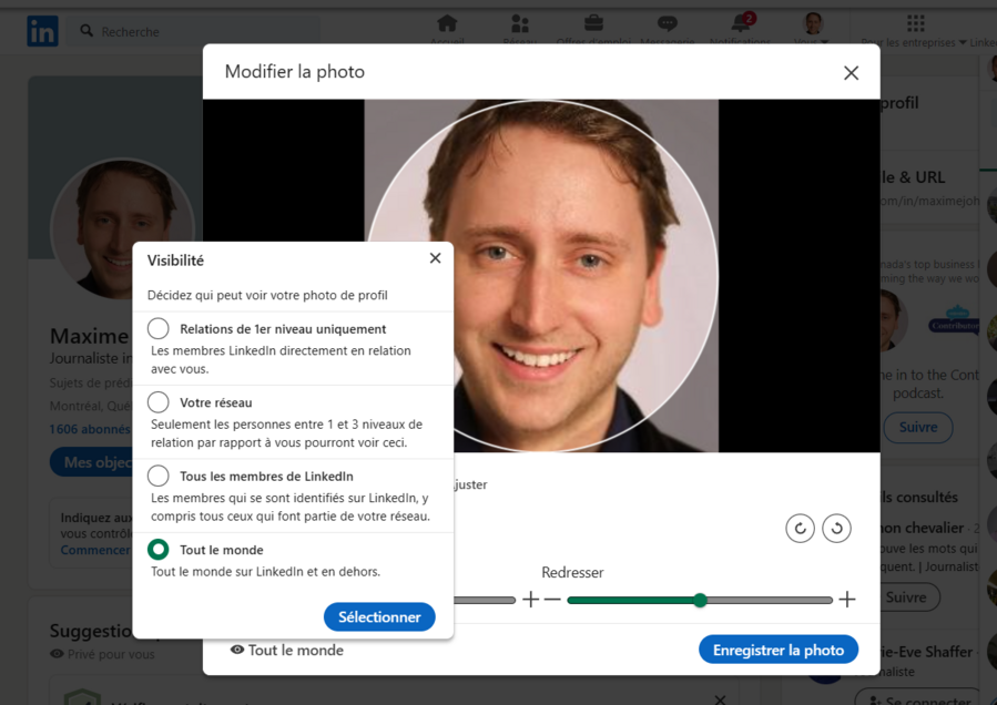 Sur LinkedIn - Cliquez sur votre photo de profil, puis sur Modifier. Cliquez ensuite sur l’icône d’œil en bas à gauche de la fenêtre pour choisir la visibilité de l’image. Par défaut, votre photo peut être vue par tout le monde, même en dehors de LinkedIn. Vous pouvez opter pour une visibilité plus réduite, comme à tout LinkedIn seulement, ou à vos contacts uniquement.