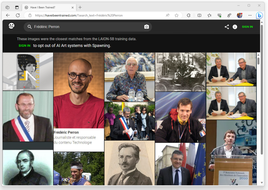 Notez toutefois que la recherche par photo n’effectue pas de reconnaissance faciale. Il a donc été possible de retrouver la photo de Frédéric en cherchant à partir d’une version rognée de l’image trouvée précédemment, mais pas à partir d’un autre portrait. Autrement dit, ce n’est pas parce que vous ne retrouvez pas votre photo sur HaveIBeenTrained.com que celle-ci n’est pas dans la base de données.