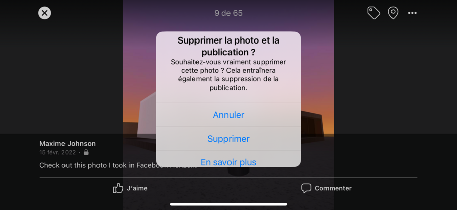 Ici aussi, la marche à suivre varie d’un site à l’autre et elle est assez facile. D’une manière générale, une option de suppression (généralement accompagnée d’une icône de poubelle) devrait être accessible près de la photo. Sur Facebook, par exemple, il suffit d’ouvrir la photo et de cliquer sur les trois petits points en haut à droite de l’écran (tant sur le web que sur l’appli mobile), puis de sélectionner Supprimer la photo.