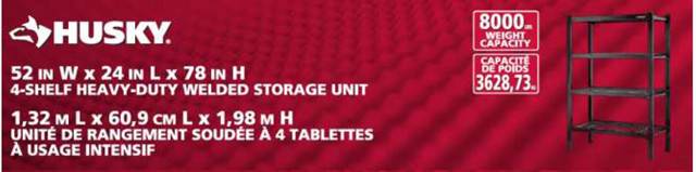 Étagère soudée à quatre tablettes Husky (4 pieds), modèle SLF-004, dimensions: 52" L x 24" P x 78" H, CUP 755858400402, article 1001032592